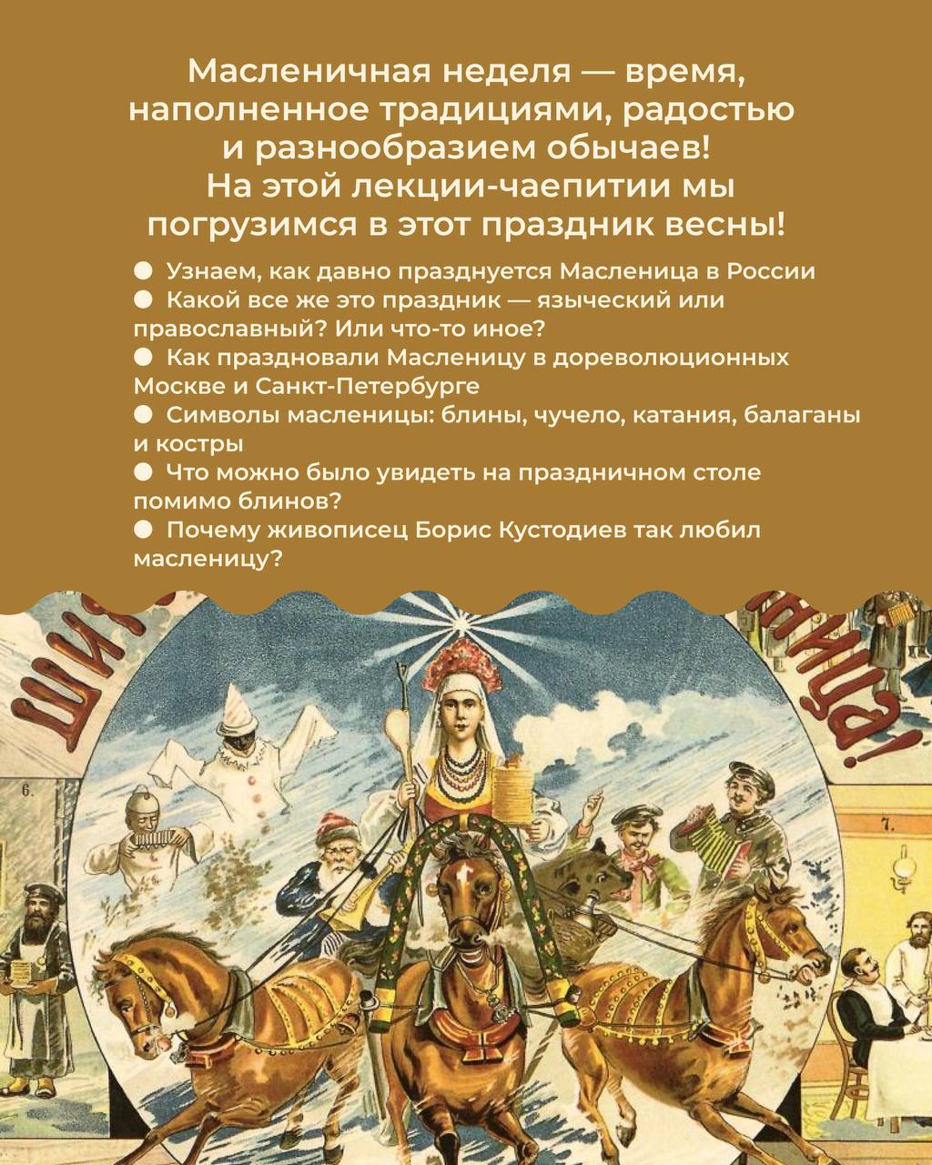 В формате неспешного разговора мы погрузимся в богатую культуру и традиции праздника, его смыслы и образы: от языческих корней до городских гуляний дореволюционной Москвы и Петербурга, от символики блинов и чучела до картин Кустодиева.