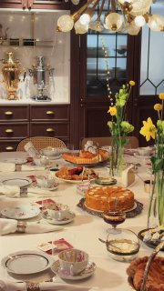 С 16 февраля в Чайной школе Нитки на Гоголевском бульваре началась Масленичная неделя — лекции с блинами, горячими сбитнями и большим чайным столом со скатертями.