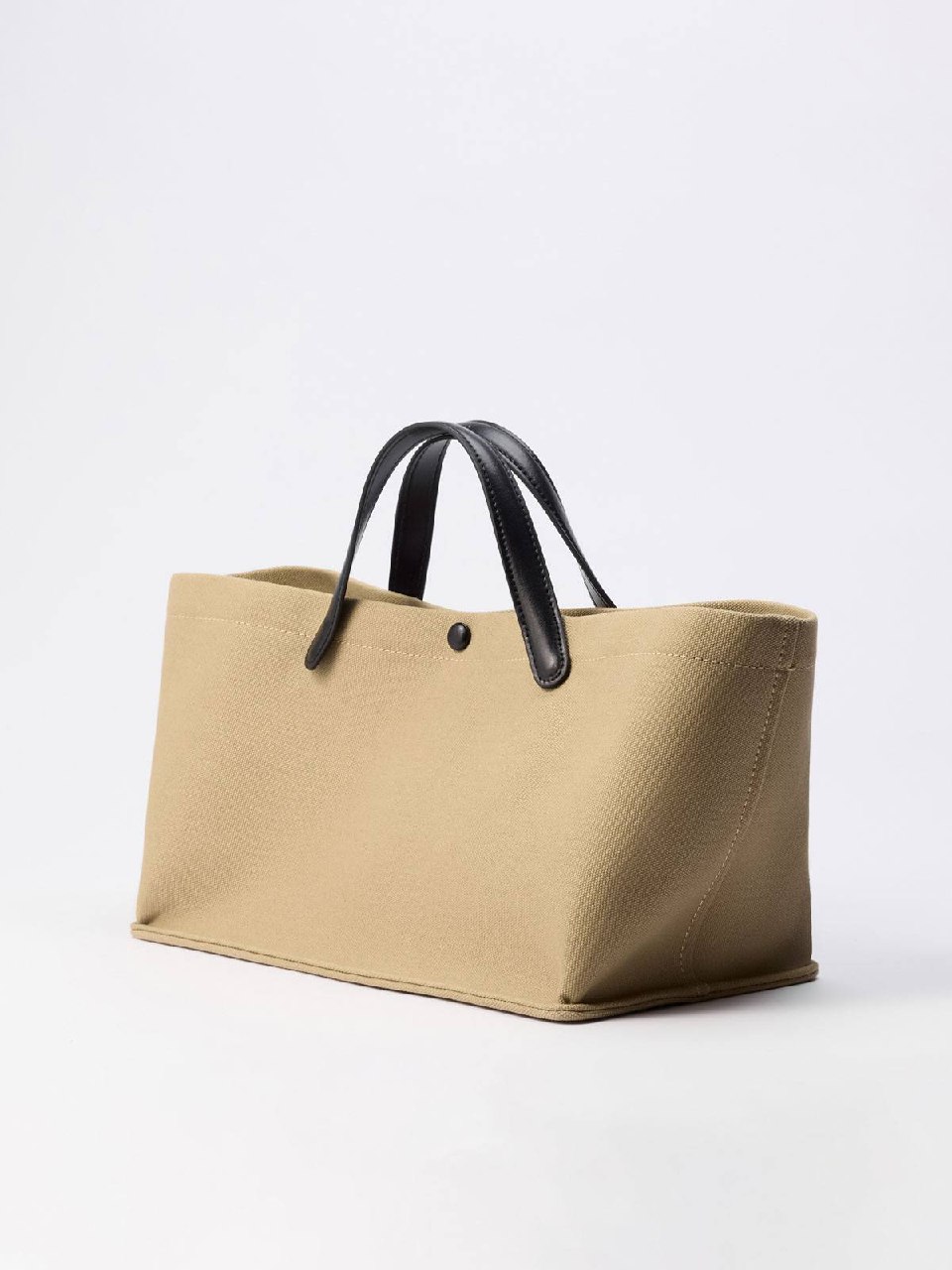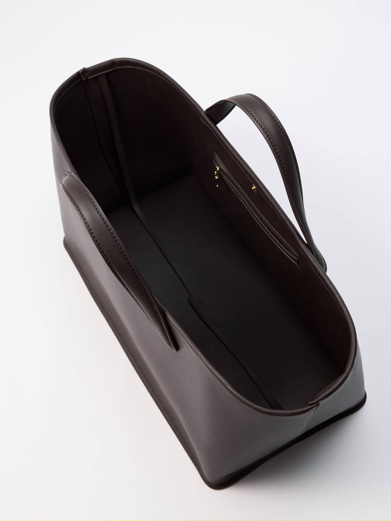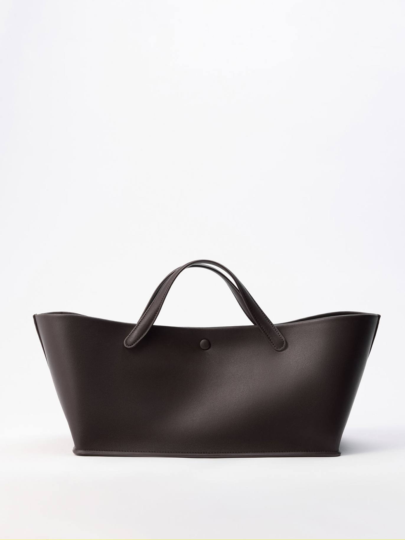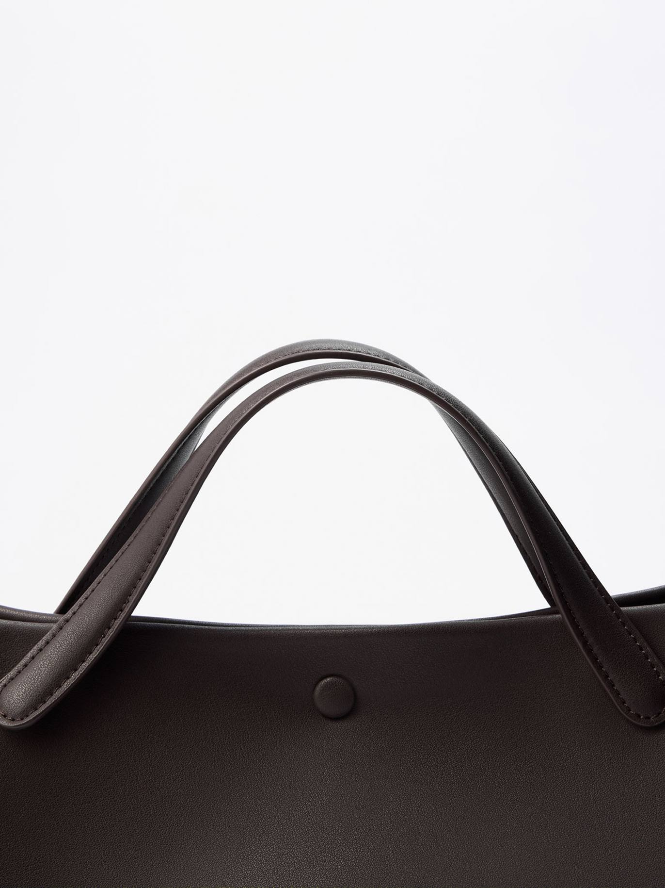 Модель с двумя длинными ручками и застежкой на аккуратную кнопку по центру, полностью обшитой кожей. Внутри сумки - кожаный шнурок, который регулирует ширину изделия и трансформирует силуэт в более аккуратный. По бокам подклада - два слота для важных мелочей и карман на молнии.