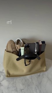 • Сумка тоут из канвы с обработкой деталей натуральной телячьей кожей. Сочетание деликатного бежевого оттенка текстиля вместе с гладкой кожей