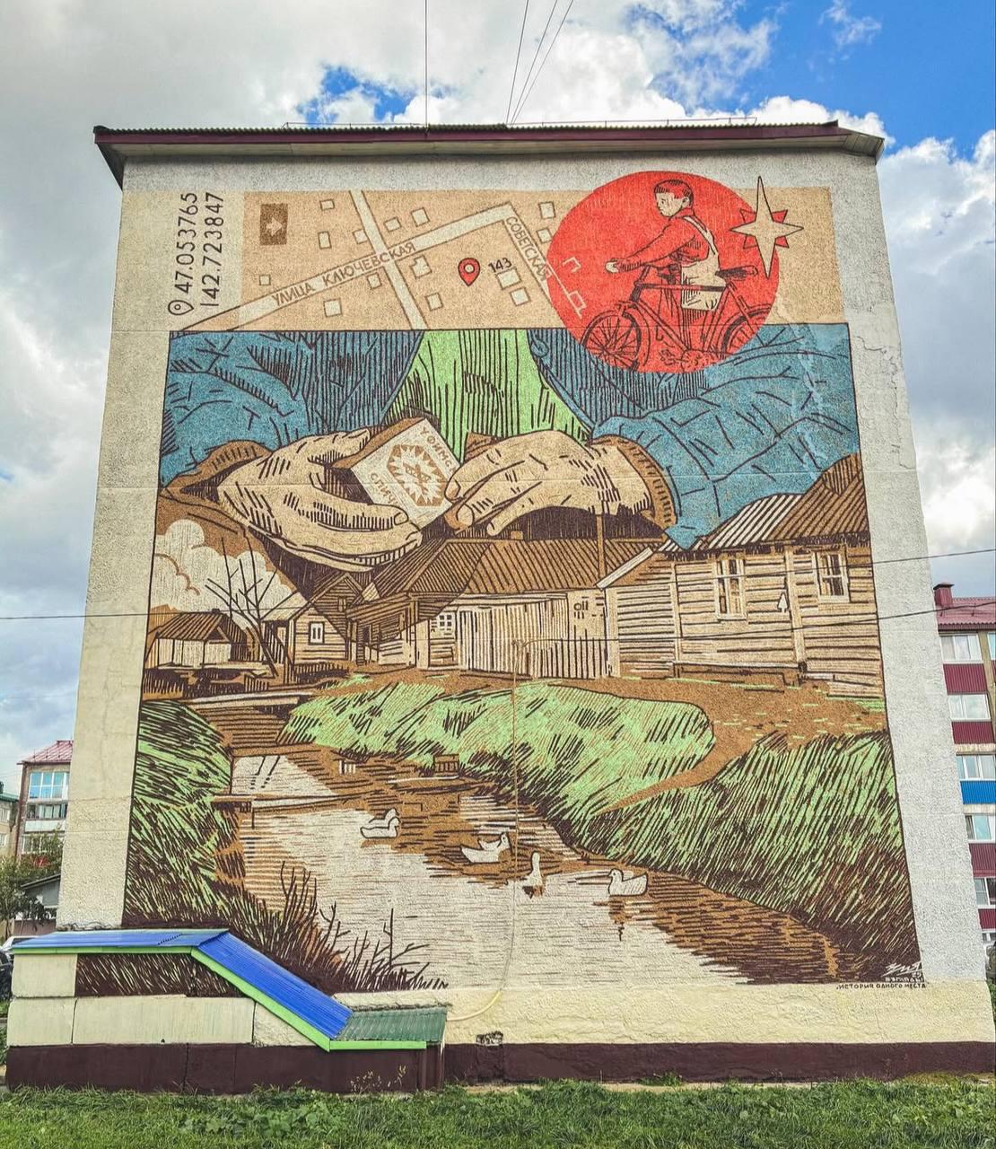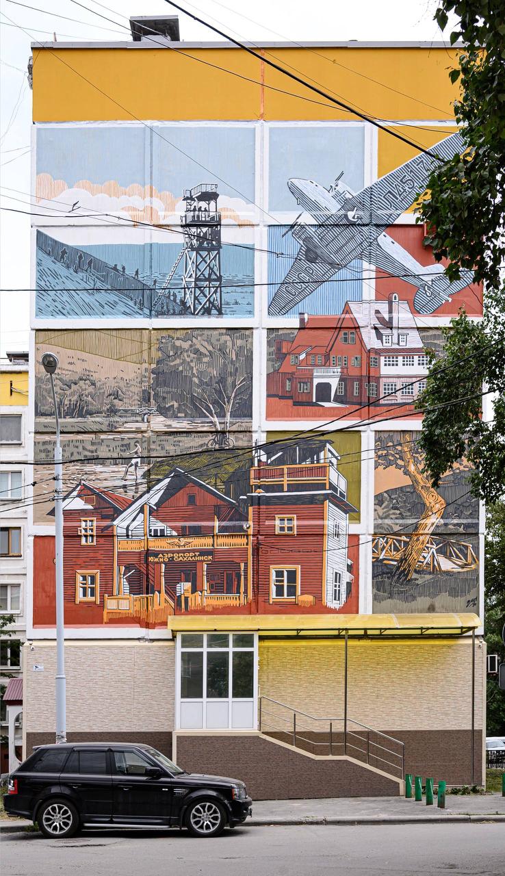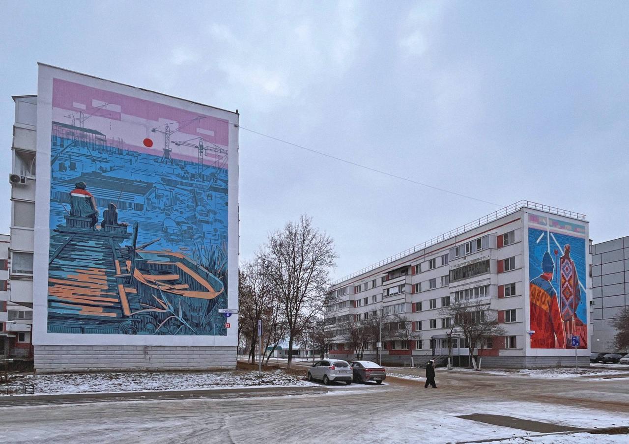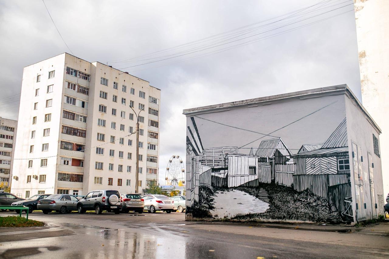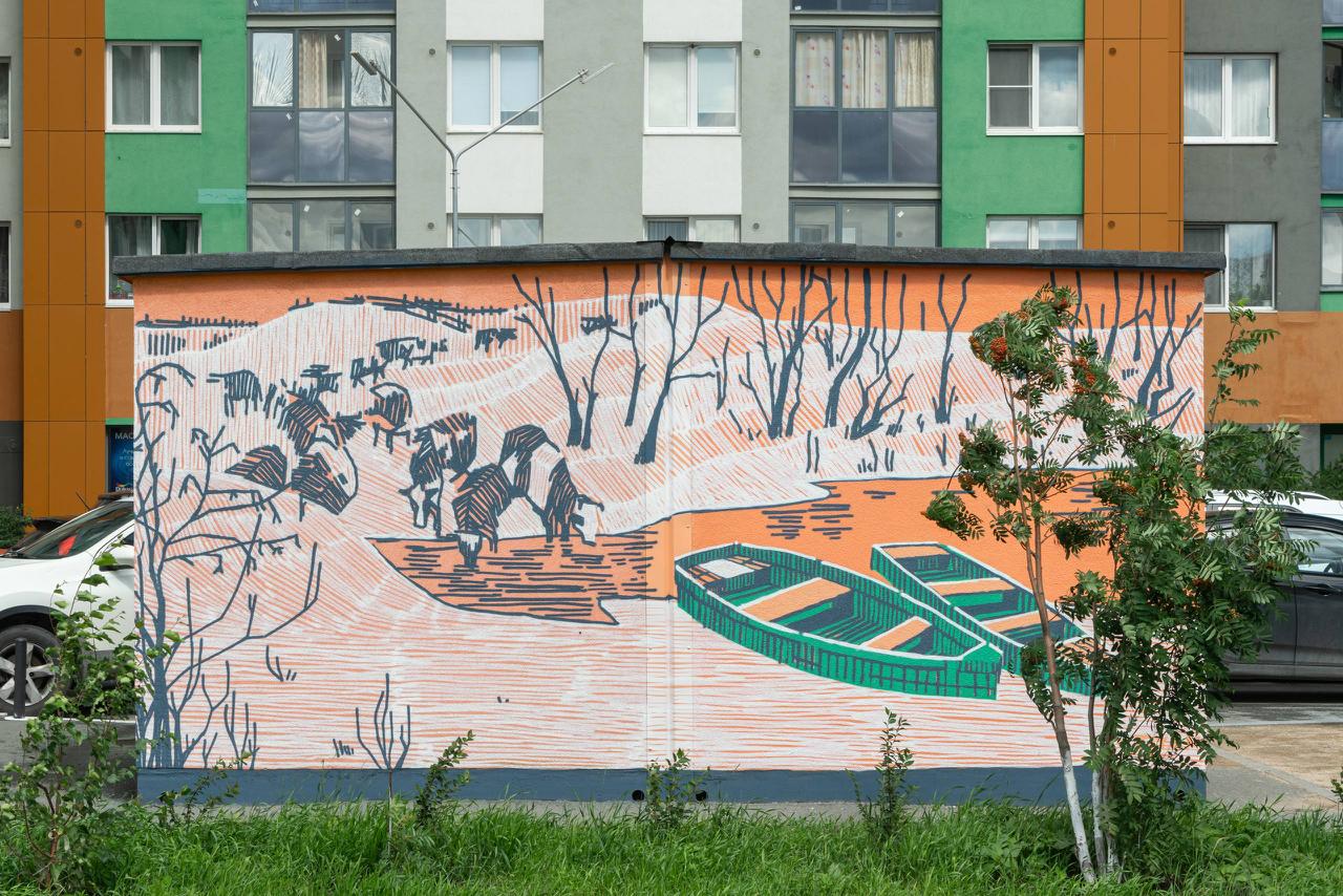 Свой подход в паблик-арте Мансур называет «стенографикой» — это перенос графического рисунка, созданного с опорой на традиционные техники (вертикальная штриховка, минималистичная цветовая палитра), в масштаб городской стены. Художник пристально работает с контекстом и историей места, стремясь к гармоничному сочетанию авторского изображения с городской средой.