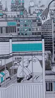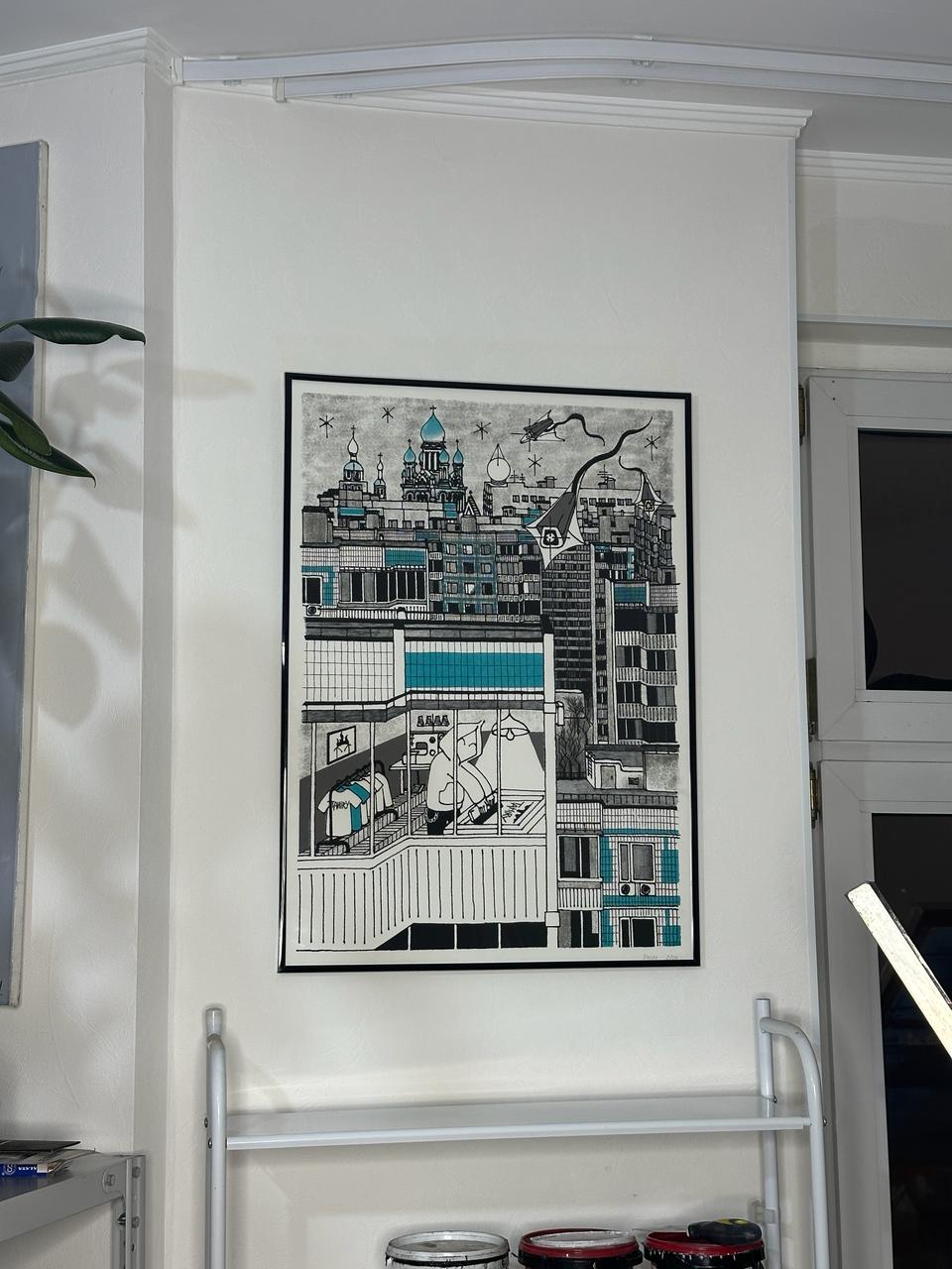 Работа выполнена линерными контурами и карандашной штриховкой в голубых оттенках типовых домов серии П-44. Издательский принт от мастерской Принт Мафия, выполнен в технике шелкографии. Формат 50 × 70 см, 3 краски.