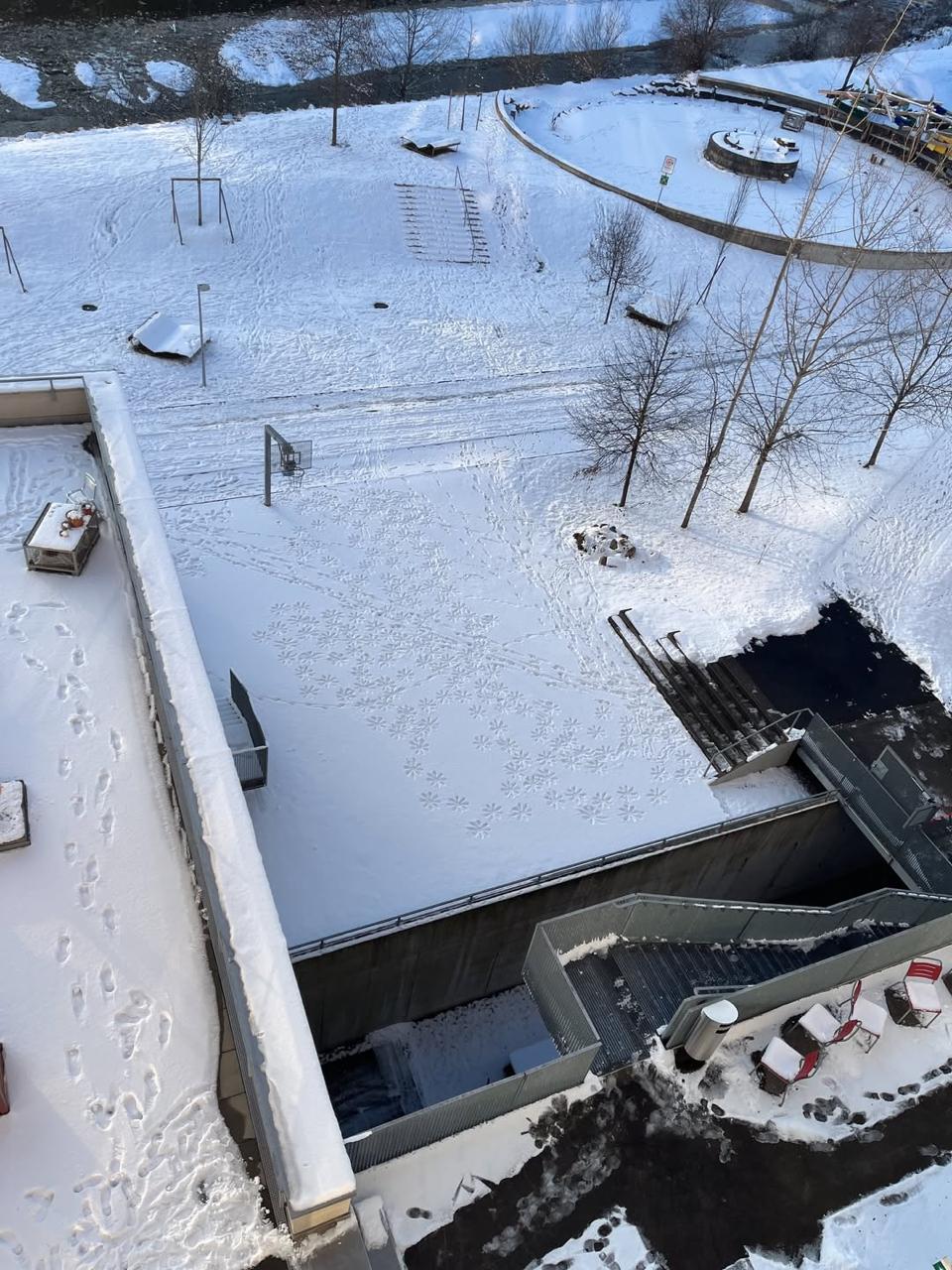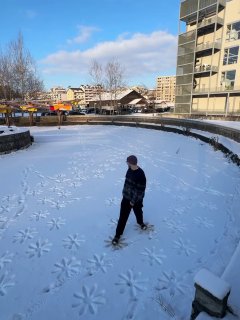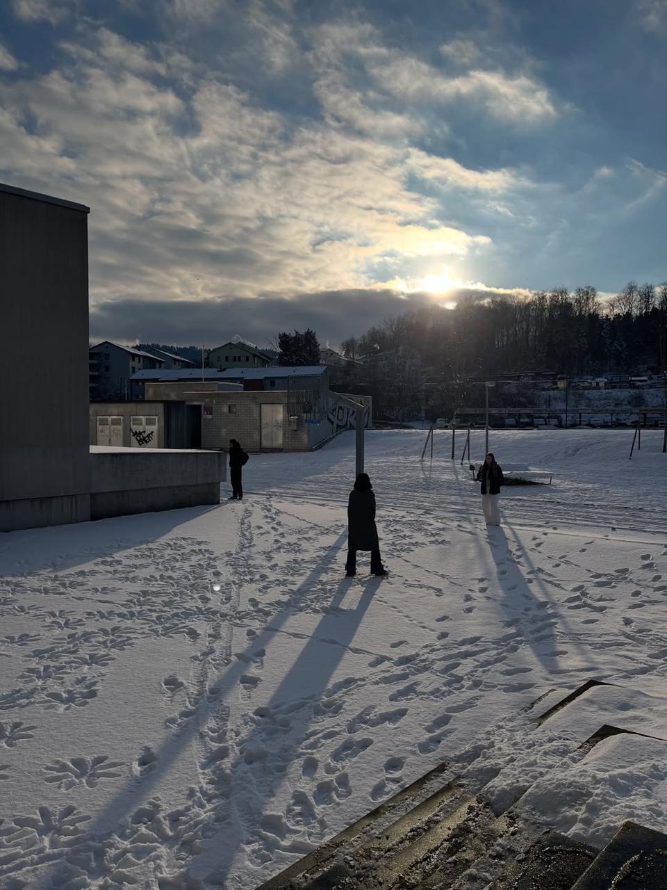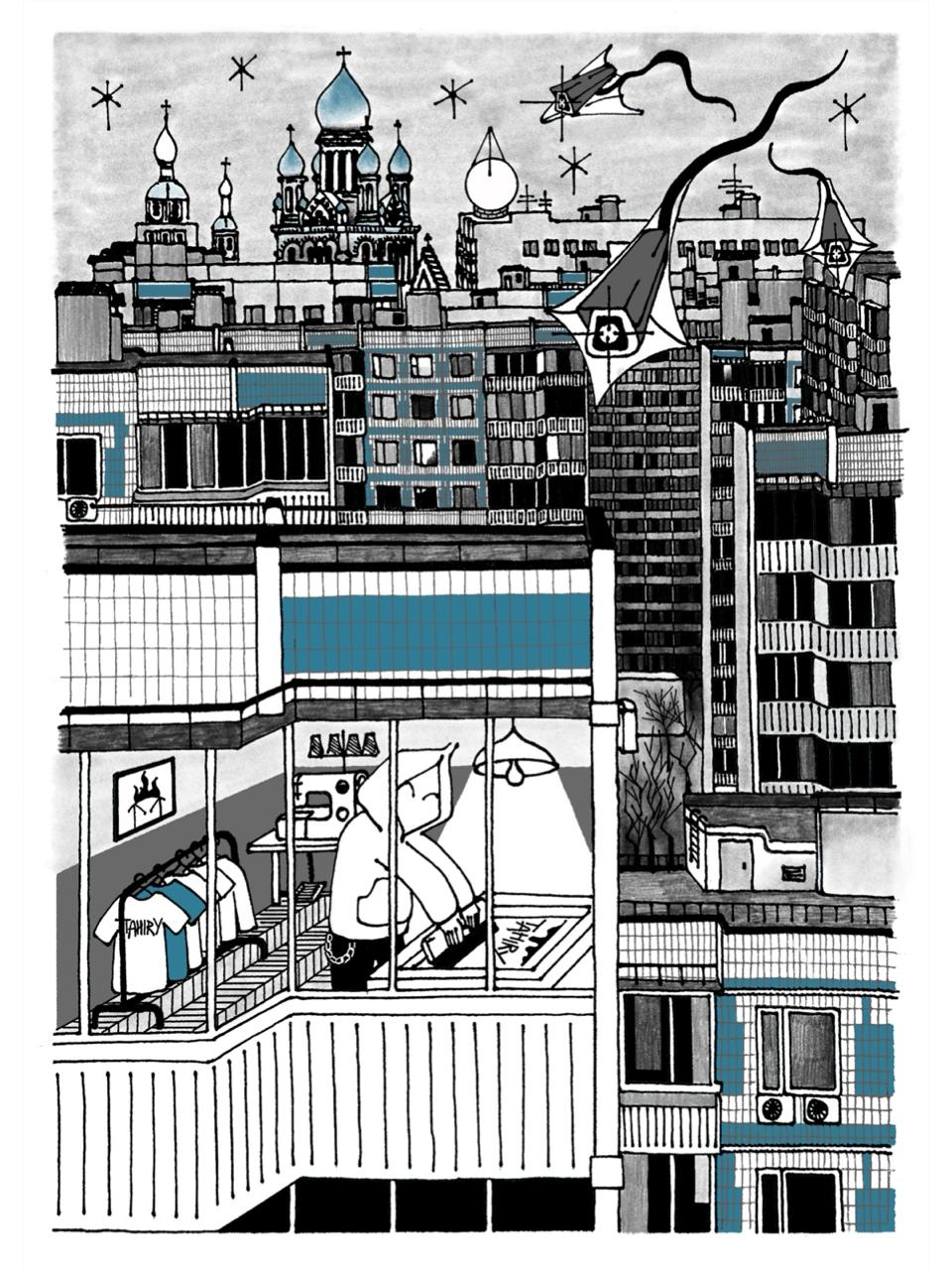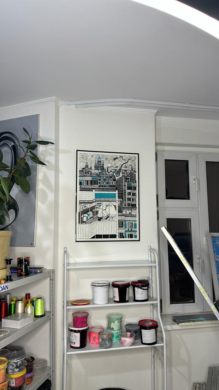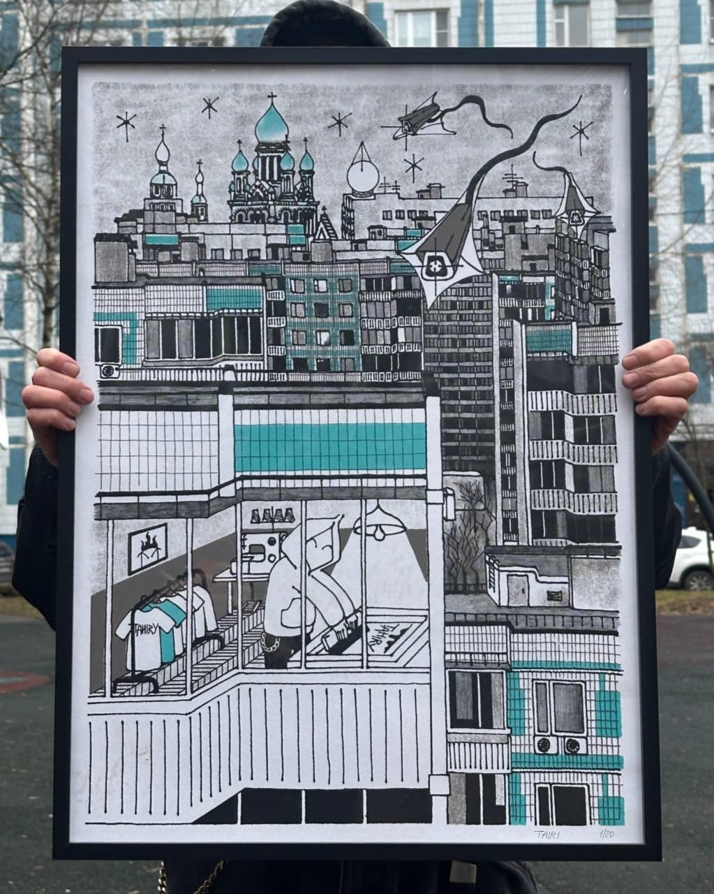 На принте изображён спальный район. В одном из окон панельных домов художник поместил автопортрет — себя в домашней мастерской. По небу плывут камеры, напоминающие воздушных змеев. Сцена передаёт атмосферу поздней московской осени — начала зимы 2025 года: снега всё ещё нет, а город кажется отстранённым и зависшим между сезонами.