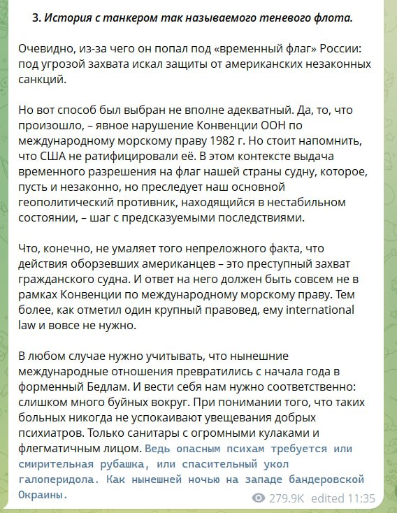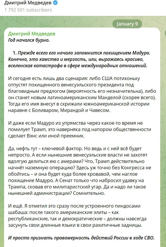 Опасным психам требуется или смирительная рубашка, или спасительный укол галоперидола Год начался бурно, отметил зампред Совбеза РФ Медведев Медведев опубликовал пост, в котором выделил 3 ключевых момента едва наступившего 2026 года. Это история с похищением Мадуро американцами, планы Трампа по новым санкциями против России и история с танкером. Также зампред Совбеза РФ назвал удар «Орешником» спасительным уколом галоперидола.
