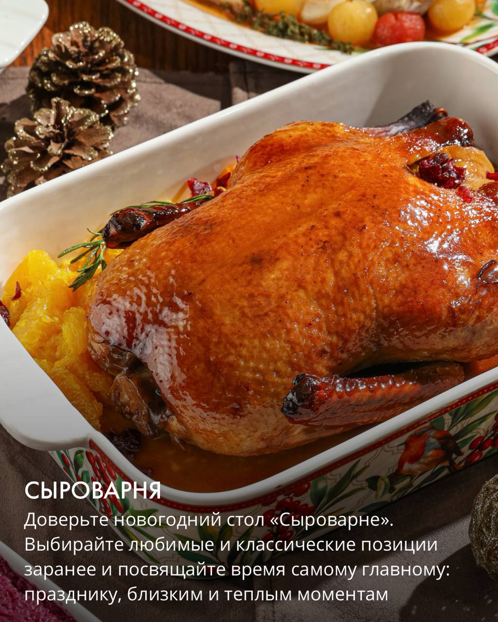 Самовар с горячим паром, мимоза, борщ и блюда новогоднего стола создают настроение русского зимнего меню: теплого, щедрого, родного.