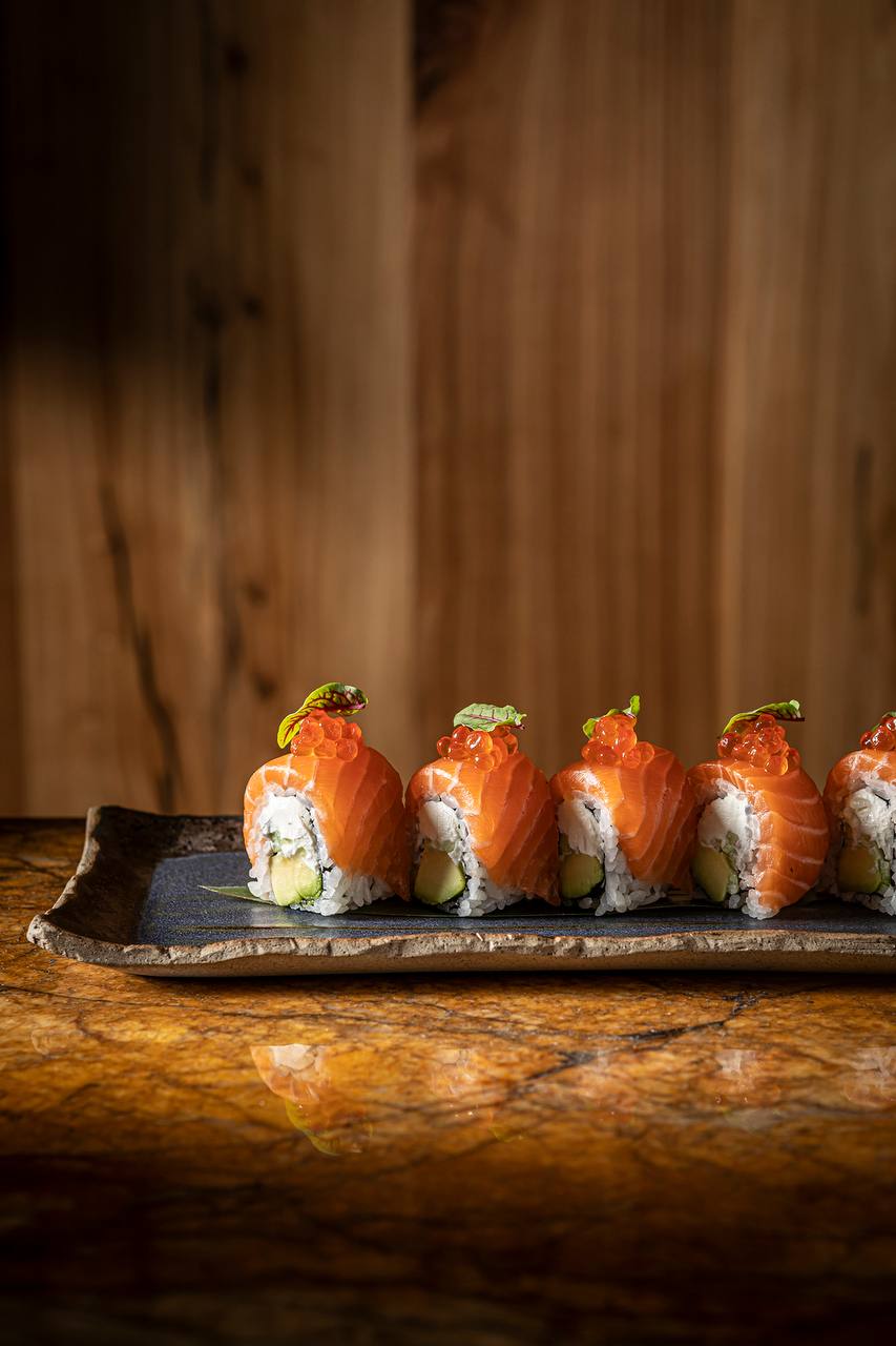 Ролл с лососем и икрой Нежная классика: сливочный сыр, авокадо, свежий огурец и охлажденный лосось. Сверху — красная икра, которая добавляет солоноватые акценты и ощущение праздника.
