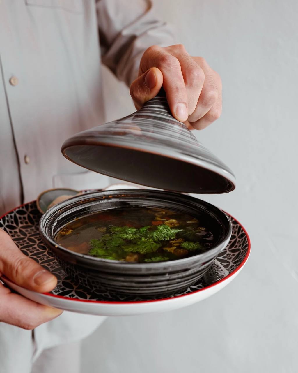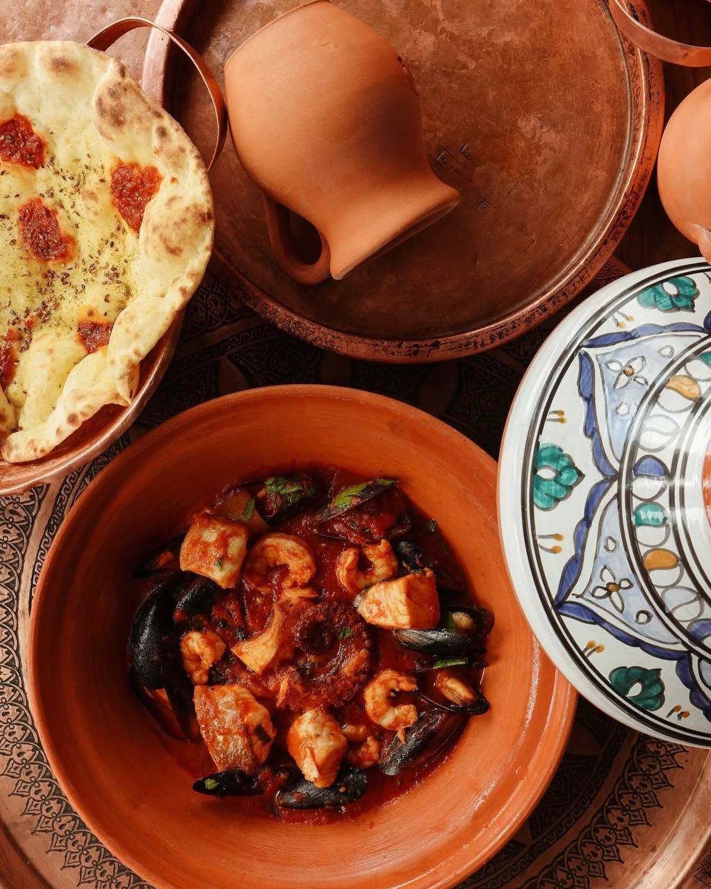 Тажин с морепродуктами — нежное филе лосося, сибаса, в сочетании с креветками, мидиями и осьминогом, томлеными под крышкой тажина со специями и овощами. Восток в чистом виде.