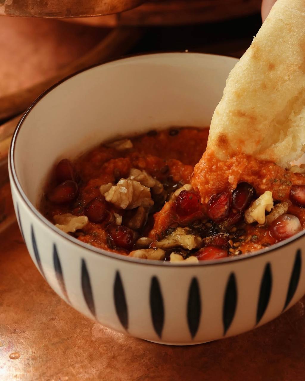 Мухаммара — насыщенное мезе со сладким болгарским перцем, чесноком и ароматным соусов наршарабом. Ярко, пряно идеально вместе с лепешкой.