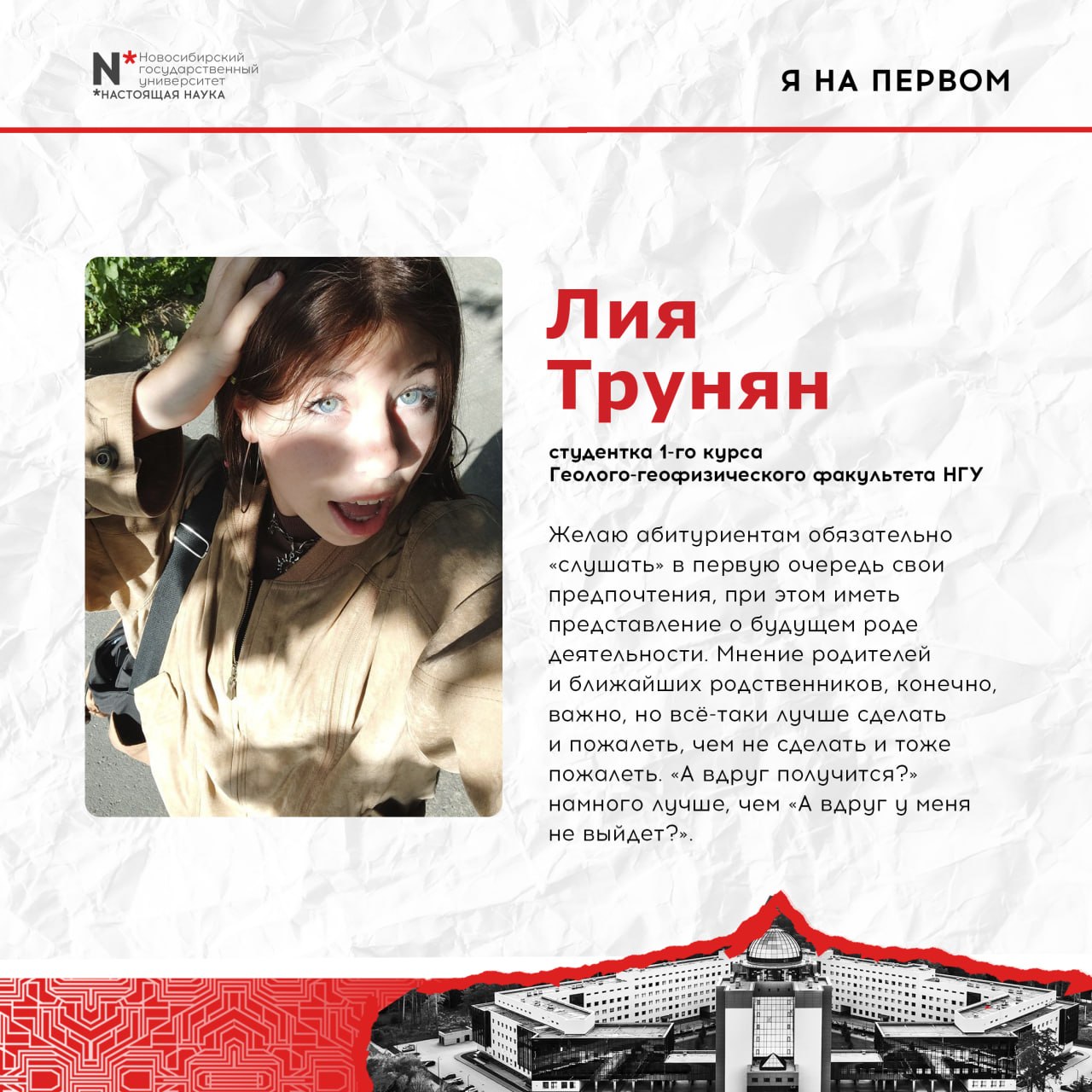 Ориентироваться на свои предпочтения, действовать и руководствоваться принципом «А вдруг получится?» — советует абитуриентам, которые в этом году поступают в НГУ, Лия Трунян, студентка 1-го курса Геолого-геофизического факультета НГУ🌎