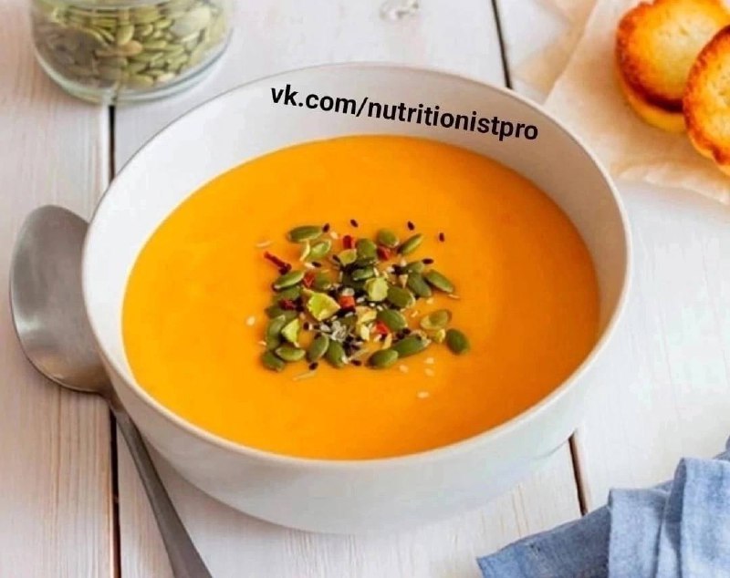 Легкий и очень полезный суп-пюре из тыквы с приятным сливочным вкусом. При подаче на стол суп желательно посыпать тертым сыром, тыквенными семечками или дополнить ржаными сухариками.