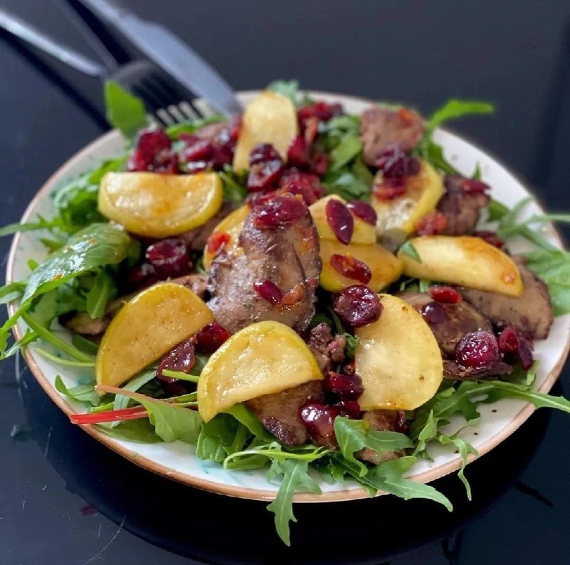 ТЕПЛЫЙ САЛАТ С ПЕЧЕНЬЮ И ЯБЛОКАМИ 📌Очень рекомендуем попробовать этот салат! Все предельно просто, но по вкусу- полный восторг🤩 ✅Ингредиенты: Салатный микс- 60г (руккола, шпинат, мангольд); печень куриная (или кролика, или индейки и т.д.)-200-250г; яблоко зеленое- 1 шт; апельсин-1 шт; клюква вяленая - горсть (~20 г), можно заменить вяленой вишней, черносливом или курагой; сахар-1/2ч.л; зира-1/2 ч.л; масло растительное, сливочное 30+10 г; соль,перец ✔️Из апельсина выжимаем сок, снимаем цедру, добавляем в сок. Замачиваем клюкву в апельсиновом соке. ✔️Тем временем нарезаем печень средними кусками (~см 5), слегка присыпаем мукой. В сковороду наливаем растительное масло, добавляем немного сливочного, высыпаем зиру и нагреваем. Быстро обжариваем печень с двух сторон (минуты по две с каждой стороны). Снимаем с огня, солим, перчим. Держим под крышкой, чтобы не остыла. ✔️Яблоко нарезаем дольками. Обжариваем на сливочном масле с добавлением 1/2 ч.л. сахара. Перекладываем в тарелку, накрываем крышкой. ✔️В сковороду, где жарились яблоки, выливаем апельсиновый сок с клюквой, доводим до кипения, добавляем 1 ст.л. оливкового масла, солим, перчим, снимаем с огня. ✔️На тарелке раскладываем салатный микс, сверху укладываем кусочки печени, яблоки, поливаем соусом. Наслаждаемся!