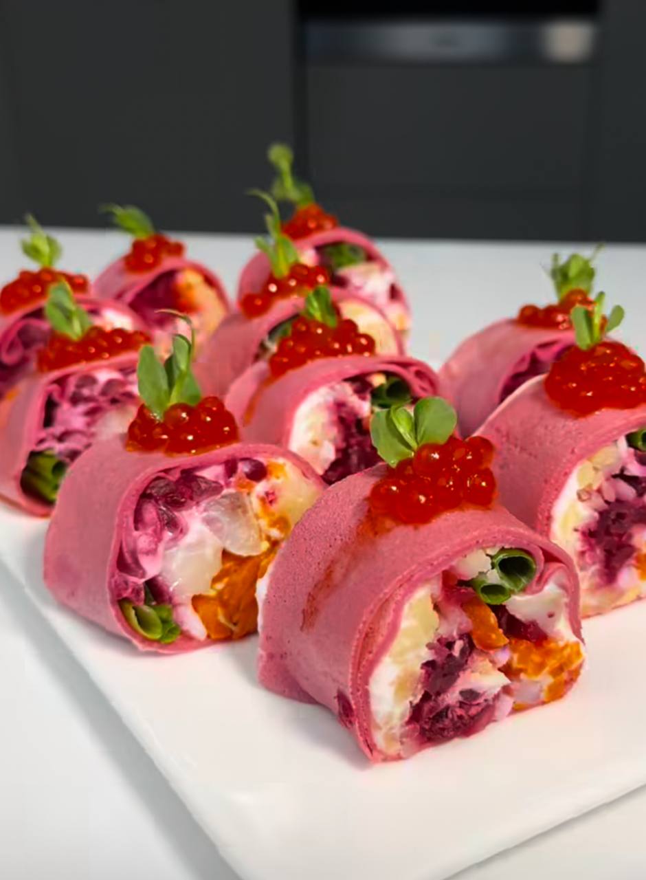 ✅ПП-блины «Шуба» с сельдью 🎄Праздничная подача, лёгкий состав, подходит для меню похудения.🔴 Выход: 6 рулетиков (1 порция = 2 рулетика) ✅Ингредиенты Для ПП-блинов ▪️Молоко 1,5% — 200 мл ▪️Яйца — 2 шт ▪️Овсяная мука — 80 г ▪️Свёкла варёная — 80 г ▪️Оливковое масло — 10 г ▪️Соль — щепотка ✅Для начинки ▪️Свёкла варёная — 120 г ▪️Картофель варёный — 120 г ▪️Морковь варёная — 100 г ▪️Яйца варёные — 2 шт (100 г) ▪️Филе сельди слабосолёной — 120 г ▪️Греческий йогурт 2% — 120 г ▪️Горчица — 5 г ▪️Зелёный лук — 20 г ✅Для подачи ▪️Микрозелень ▪️Красная икра — по желанию (5–10 г на всю порцию) ✅Приготовление ▪️Для теста все ингредиенты взбить блендером до однородности ▪️Выпекать тонкие блины на хорошо разогретой антипригарной сковороде без масла ▪️Овощи и яйца натереть на мелкой тёрке ▪️Йогурт смешать с горчицей ▪️На блин выложить слоями овощи, яйца, кусочки сельди, немного соуса и зелёный лук ▪️Свернуть рулетом, нарезать порционно ▪️Украсить микрозеленью и икрой 🚩КБЖУ 🔸На 1 рулетик ▪️Калорийность — ~120 ккал ▪️Белки — 7 г ▪️Жиры — 5 г ▪️Углеводы — 11 г 🔸На порцию (2 рулетика) ▪️~240 ккал ▪️Б — 14 г ▪️Ж — 10 г ▪️У — 22 г
