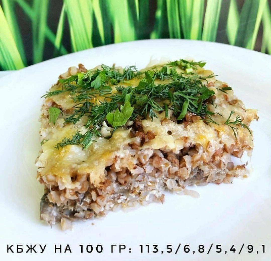 ГРЕЧНЕВАЯ ЗАПЕКАНКА Ингредиенты: гречневая крупа- 300 гр в сухом виде; молоко 2,5% - 200 мл; яйцо - 4 шт; сыр твёрдый - 200 гр шампиньоны - 300 гр; зелень, соль, специи по вкусу. Гречку предварительно отварить, можно в в мультиварке. Грибы порезать, сыр натереть на тёрке. В противень выложить слоями: половина гречки— посыпать сыром— грибы вторая половина гречки посыпать сыром. Взбить молоко с яйцами вилкой и залить смесью нашу запеканку. Запечь в духовке при температуре 180 градусов около 20 мин. Кбжу на 100 гр: 113,5/6,8/5,4/9,1