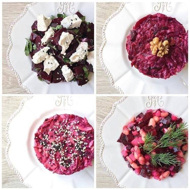 Салаты со свеклой ✅Салат с сыром КБЖУ на 100 г 99/6,2/14/23 свекла запечёная 200 г Сыр сливочный 40 г Петрушка Масло растит 5 г Соль, перец Свеклу нарезаем кусочками покрупней, солим, перчим, заправляем маслом, петрушкой, перемешиваем. Кладём на тарелку свёклу, а сверху кусочки сыра ✅Салат с черносливом КБЖУ на 100 гр 127/2,9/6/16,2 свекла вареная 200 г Чернослив 40 г Грец орех 20 г Сметана 15% 30 г Соль, перец, чеснок Свеклу натираем на терке, чернослив и орехи нарезаем, солим, перчим, кладём чеснок и заправляем сметаной. ✅Салат с яйцом КБЖУ на 100 гр 115/6,6/6,5/7,3 свекла вареная 200 гр Яйцо отварное 1 шт Сыр 40 г ( твёрдый) сметана 15% 30 г Соль, перец, чеснок Свеклу натираем на тёрке крупной, сыр и яйцо также на тёрке. Смешиваем, добавляем чеснок, специи и сметану, перемешиваем. ✅Салат с яблоком КБЖУ на 100 г 72/2,7/1,5/12 свекла 200 г Яблоко 50 г Фасоль консервированная 80 г Масло 5 г Лук 20 г Соль, перец Свеклу, лук, яблоко нарезаем кубиком + фасоль, соль и перец, заправляем маслом.