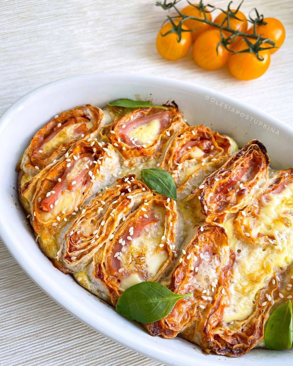 УЛИТОЧКИ ИЗ ЛАВАША С ВЕТЧИНОЙ И СЫРОМ🧀   Сыыыыррррно и хрустяще! Что еще нужно для вкусного завтрака или обеда и отличного настроения!!!   Выход 2 порции/ 330г.   КБЖУ на 1 порцию: 397/23/15,4/39,1. КБЖУ на 100г.: 241/13,9/9,3/23,7.   Ингредиенты: - 110г лаваша (1 лист) - 50г сыра - 100г ветчины из индейки - 40мл 1,5% молока - 2 яйца - 50г томатного соуса или кетчупа - 2г кунжута для украшения - соль, специи по вкусу.   Приготовление: На лист лаваша намазать томатный соус. Сыр натереть, ветчину нарезать. Выложить на лаваш сыр и ветчину, свернуть в рулет, нарезать на одинаковые кусочки. Выложить в форму. Кусочки рулета должны быть не выше формы, плотно уложены. Взбить яйца с молоком и солью, можно добавить любимые специи. Залить сверху так, чтобы попало на каждый кусочек рулета. Посыпать кунжутом. Выпекать в разогретой духовке 20-25 минут при температуре 180 градусов. Как зарумянилось – готово.