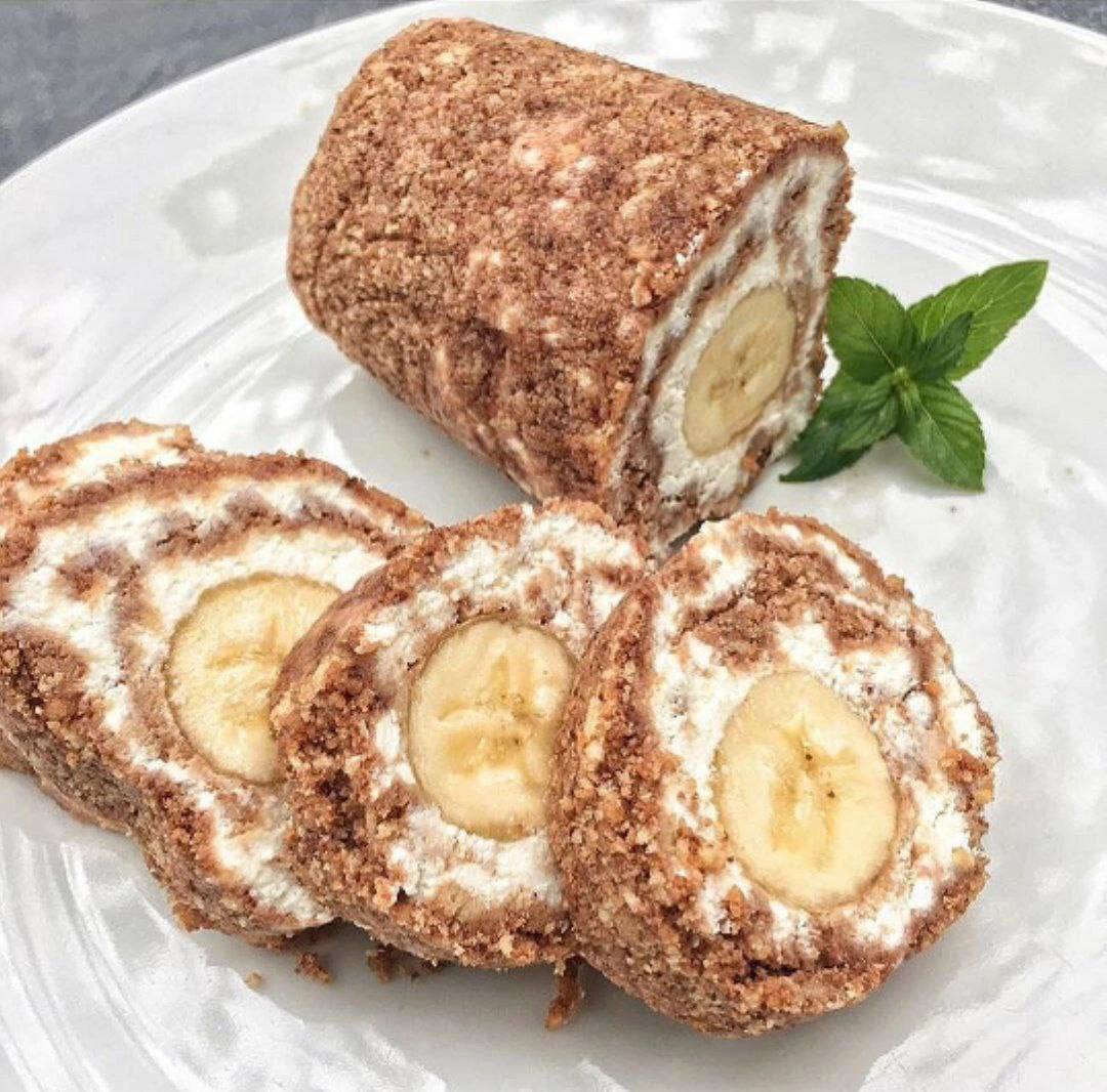 ТВОРОЖНО-БАНАНОВЫЙ РУЛЕТ КБЖу на 100 г: 246/10/9/31 Ингредиенты Галетное печенье 400г (у нас печенье «Мария») Творог 5% 400 г Банан крупный 1 шт Какао-порошок 2 ст л Молоко 80 мл Масло сливочное 50 мл ванилин по вкусу -подсластитель по вкусу (у нас стевия) Приготовление: 1 . Печенье измельчить в крошку, добавить 50 мл молока, какао и все перемешать 2. Творог взбить в блендере с размягченным маслом, 30 мл молока, ванилью, подсластителем до однородной массы. З. Выложить на пищевую пленку смесь с печеньем, разровнять слоем в 1-1 ,5 см 4, сверху распределить ровным слоем творожную смесь 5·Бананы выложить на край и завернуть плотны и рулет. 6. Отправить в холодильник на пару часов.