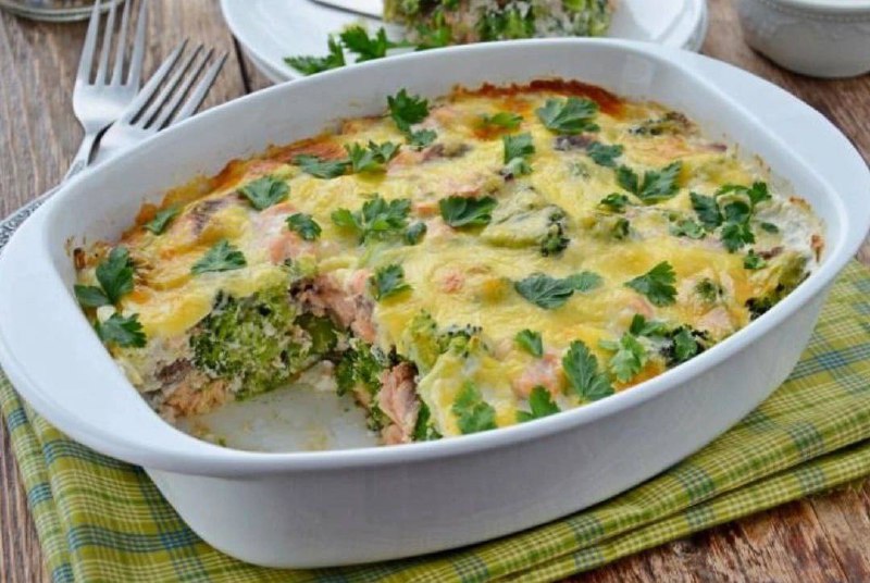 ✅ЗАПЕЧЕННЫЙ ЛОСОСЬ С БРОККОЛИ Время приготовления: 1 час ✅Ингредиенты : 🔸Лосось — 100 г 🔸Капуста брокколи — 100 г 🔸Сок лимонный по вкусу 🔸Масло сливочное — 1,5 ч. л ( по желанию) 🔸Сыр твердый — 1 ст. л 🔸Молоко — 1,5 ст. л 🔸Сливки — 1,5 ч.л( по желанию) 🔸Яйцо куриное — ½ шт или 2 перепелиных 🔸Орех мускатный молотый — щепотка Приготовление: 1. Филе лосося нарезать ломтиками, сбрызнуть лимонным соком, посолить и поперчить. Выдержать 30 минут, залить горячей водой и припустить 10 минут при слабом кипении. 2. Брокколи залить горячей водой, посолить, варить 10 минут. 3. Сливки взбить с молоком, сыром и яйцами, приправить солью, перцем и мускатным орехом. 4. В смазанную маслом форму выложить слоями овощи и рыбу, залить сливочной смесью. Запекать 20 минут при 220° С. Для большой формы количество ингредиентов увеличить. 🔸Худеющим следует убрать из рецепта сливки и сливочное масло.