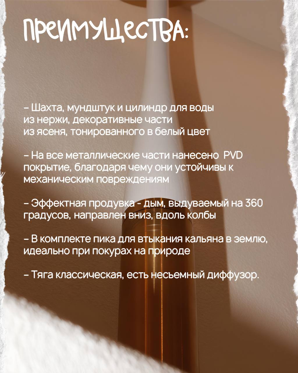 Шахта, мундштук и цилиндр для воды изготовлены из нержавеющей стали, декоративные части шахты и мундштука - из ясеня, тонированного в белый цвет;
