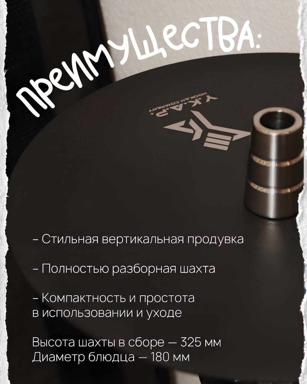 На все металлические части кальяна нанесено дорогостоящее PVD покрытие, благодаря чему цилиндр для воды и блюдце устойчивы к механическим повреждениям;