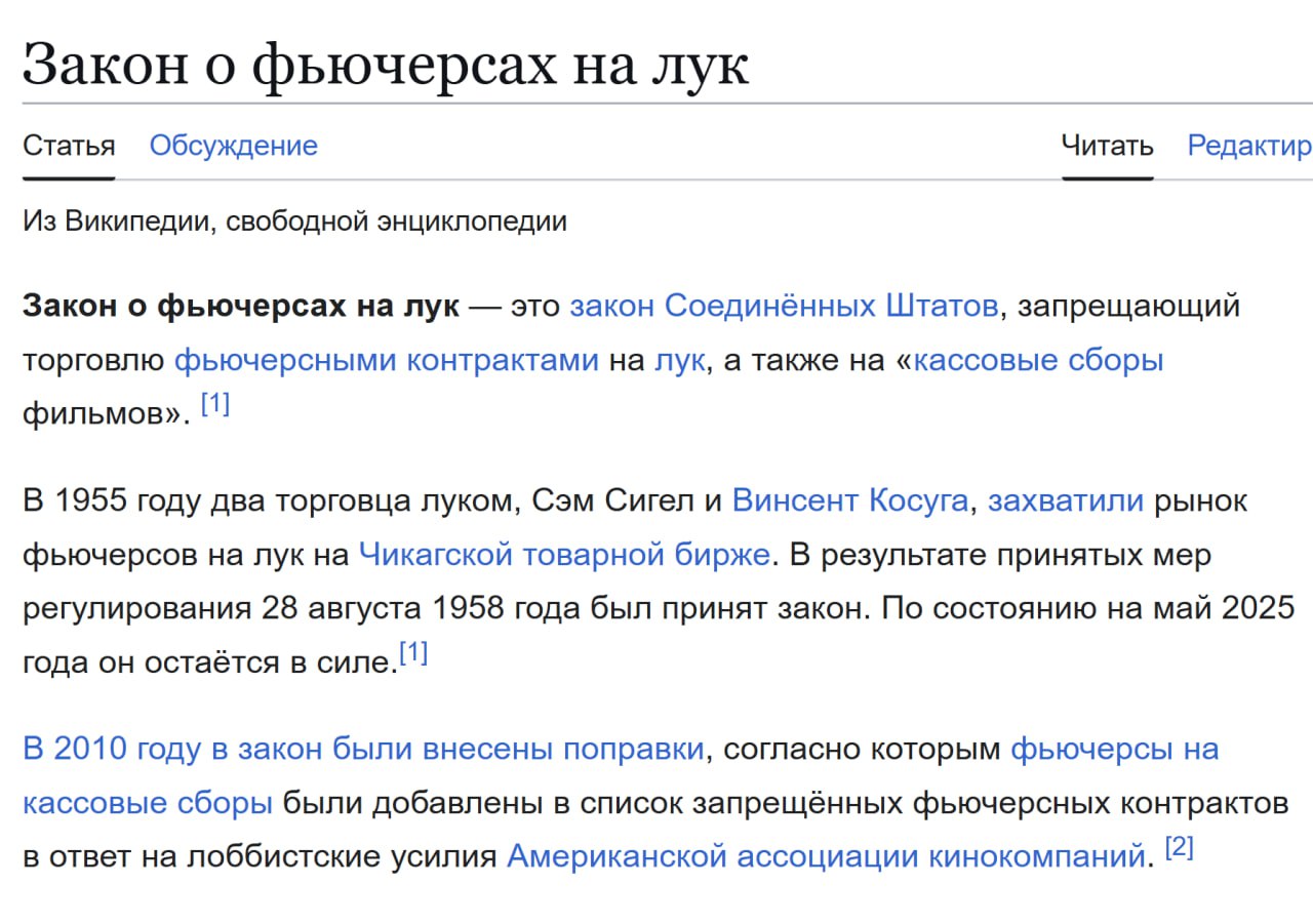 Итог: Лук стал единственным товаром в США, фьючерсная торговля которым официально запрещена законом. На дворе 21 век, а этот запрет действует до сих пор.