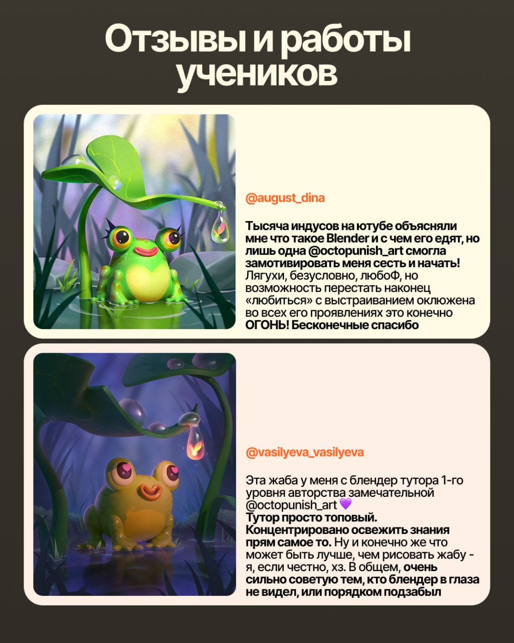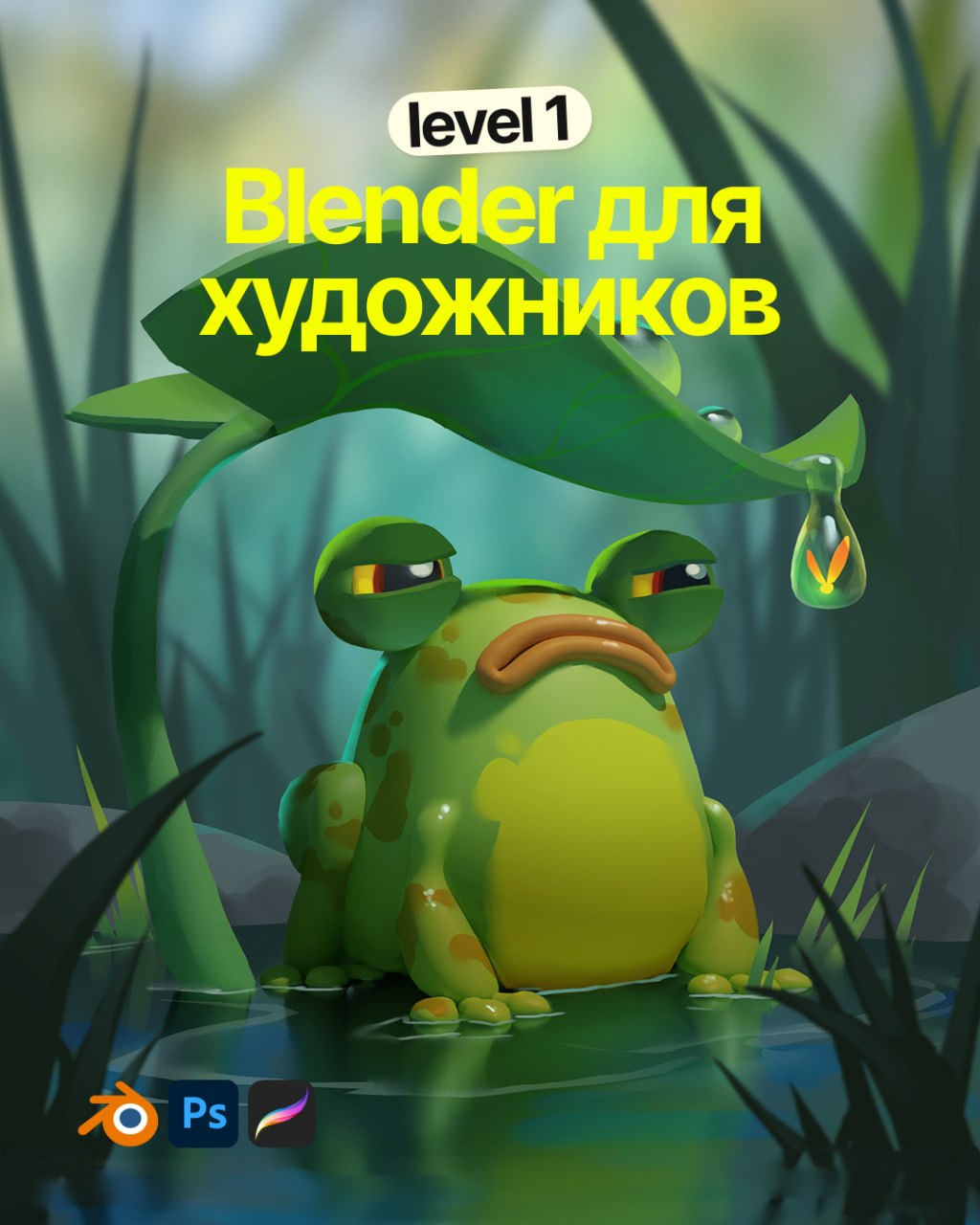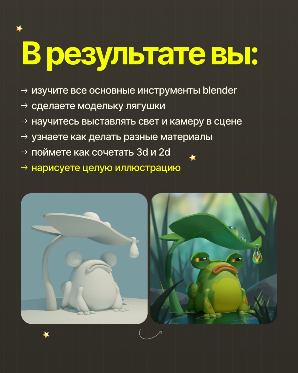 Вы научитесь всем основным инструментам, сможете делать простые модели и почувствуете себя уверенно в Блендере. Так же я покажу удобный пайплайн, как использовать 3d, чтобы облегчить работу над 2d артами, и в результате вы нарисуете целую иллюстрацию со своей жабкой!