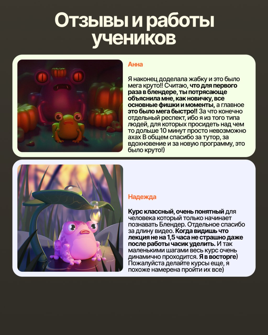 Например, я показываю, направляющие или работу с передним планом - а дальше начинаются эксперименты, ребята берут эти приемы и начинают крутить их по-своему и комбинировать с предыдущим опытом и в итоге получается что-то живое и крутое!