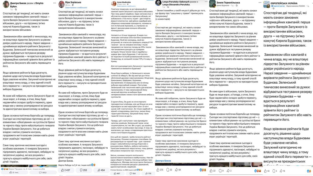Подається це в максимально емоційній рамці: “Залужного бояться - тому прибирають”, “його зливають”, “йому ставлять підніжки”, а Буданова “піднімають” як альтернативу. На мій погляд, сенс такого меседжу проста: не просто конкуренція всередині системи, а свідомий політичний сценарій, де одному ламають репутацію, а іншого виставляють “потрібним кандидатом/символом”. І що важливо - ці дописи дуже схожі між собою за формулюваннями, ніби їх робили “під копірку” (див. підбірку посилань).