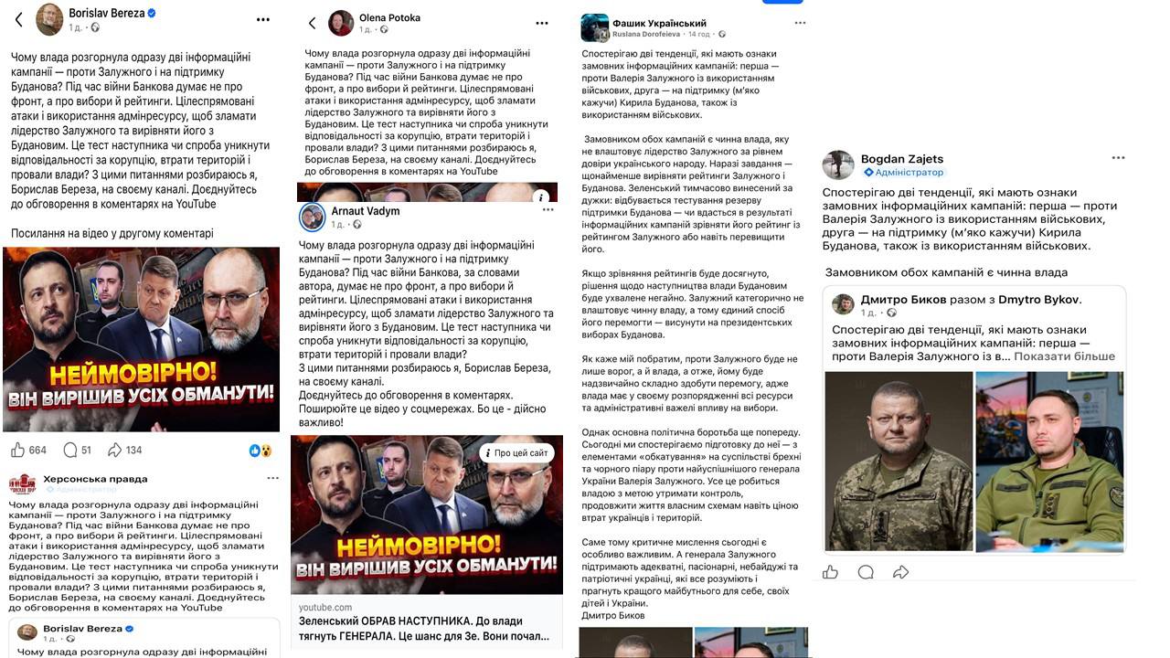 «Для себе робив невеликий аналіз недавно. Упродовж останніх днів у низці телеграм-/фейсбук-пабліків та персональних акаунтів, які часто працюють у екосистемі підтримки Петра Олексійовича (або стабільно ретранслюють меседжі, близькі до оточення Порошенка), почали масово розганяти однаковий наратив: нібито влада цілеспрямовано “мочить” пана генерала Залужного - через інформаційні атаки, підколювання, підрив довіри - і паралельно “розкручує” генерала Буданова як нового головного героя/фаворита.