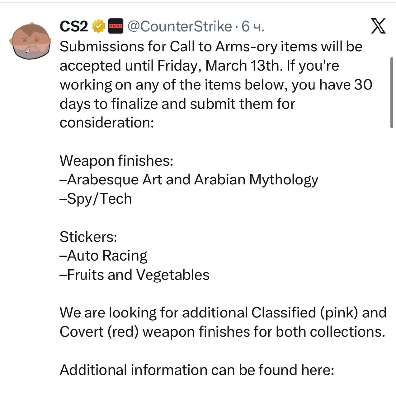 Напомню, ранее разработчики делали анонс, что ищут скины под две коллекции "Арабаская живопись и мифология", "Шпионские тематика и технологии", а также две серии наклеек "Автогонки", "Фрукты и овощи". 👀
