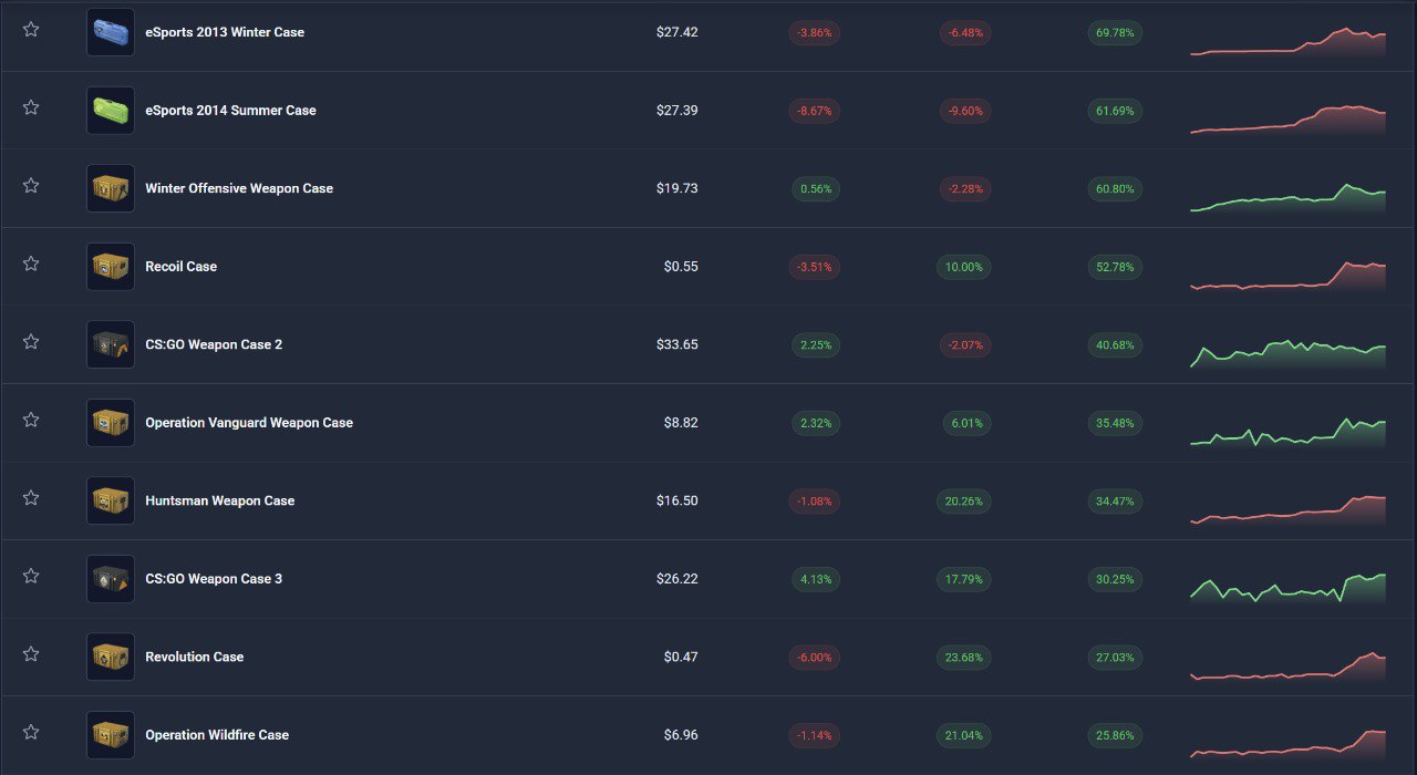 За последние 30 дней сразу ряд ящиков неплохо выросли в цене. В лидерах по росту зимний и летний esports кейсы. Оба выросли примерно в 1,8 раза! Основное их преимущество в том, что они были полностью лимитированными задолго до удаления из игры редкого пула. 👀