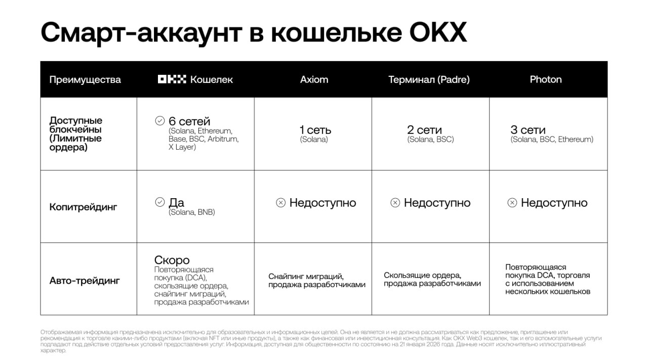 Пока другие кошельки ограничиваются одной сетью и базовым функционалом, мы выводим ваш Web3-опыт на новый уровень. Смарт-аккаунт — это не просто кошелек, это ваш личный торговый терминал.