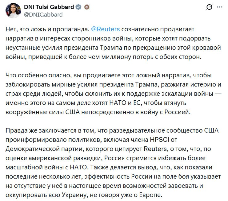 Директор Национальной разведки США Тулси Габбард жестко раскритиковала агентство Reuters, назвав его статью о планах России захватить всю Украину враньем и пропагандой:
