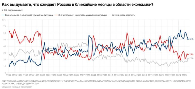 На тлі війни, падіння доходів і економічної нестабільності зростає невдоволення населення. За даними «Левада-центру», частка оптимістів щодо економічного майбутнього зменшилася з 64% до 51%, а песимістів – майже третина населення. Недовіра до дій уряду та офіційних повідомлень зростає.