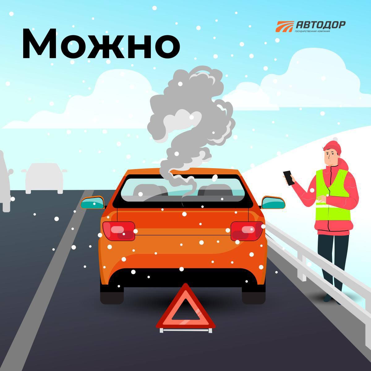 В случае вынужденной остановки включите аварийную сигнализацию, наденьте светоотражающий жилет, установите знак аварийной остановки, перейдите за барьерное ограждение и позвоните в службу аварийных комиссаров по номеру *2323.