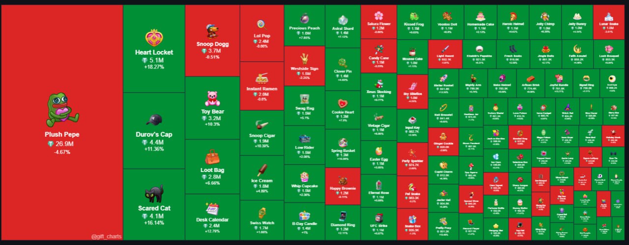 На самом деле, я связываю это больше с тем, что сегодня подросла крипта. TON дал прирост за неделю 9%, но вот что интересно, подарки выросли только на 3.3% по капитализации