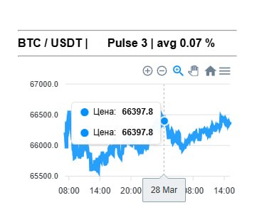 Концепт простой - подтягиваю каждую минуту цену битка, и вывожу на график, каждый час сравниваю текущую цену и то что было час назад, записываю % волатильности и изменение цены, если в рост то пульс +1 если в падение то -1