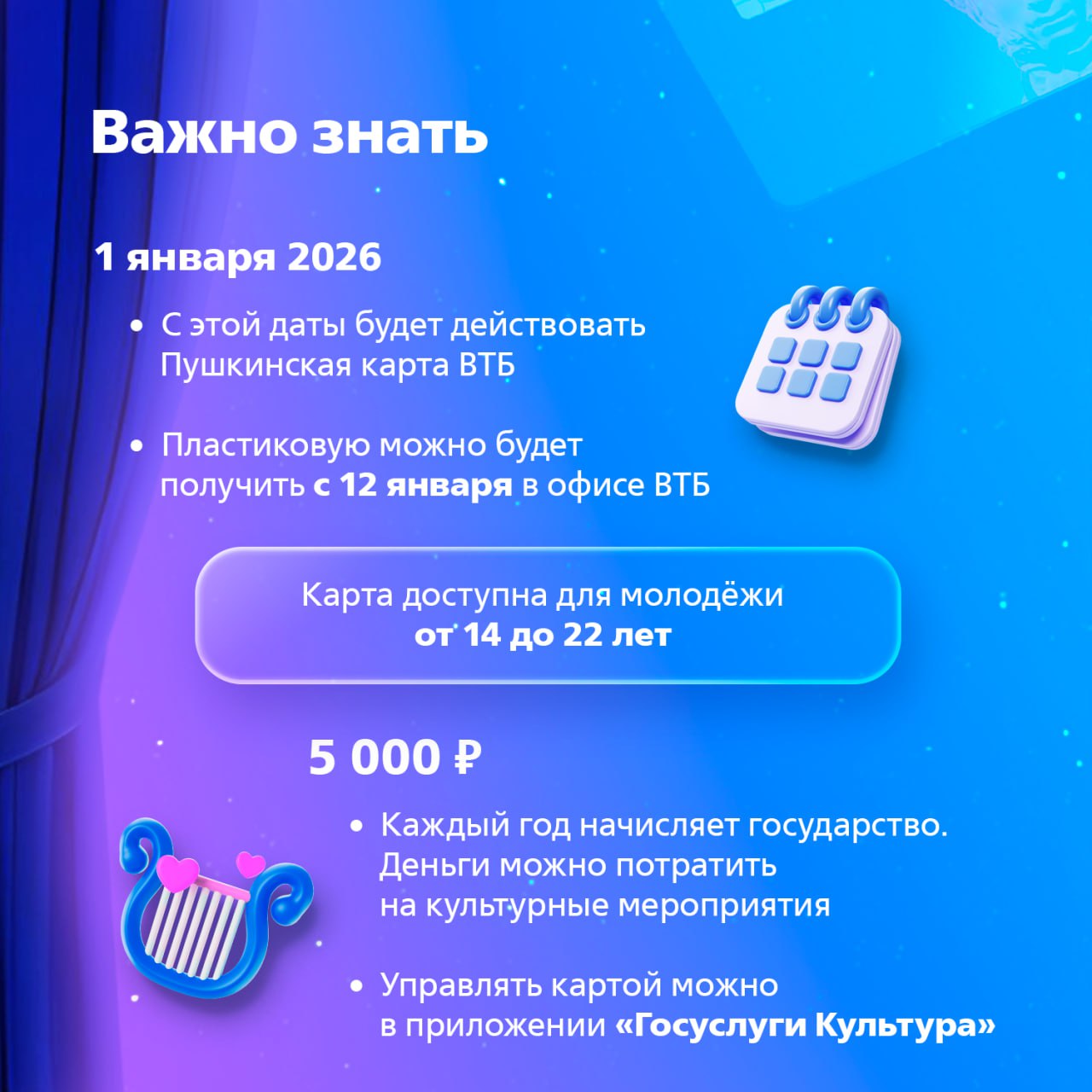 Если вам от 14 до 22 лет, и вы хотите в 2026 году получить 5000₽ от государства на театр, кино и музеи — подайте заявление на выпуск карты в ВТБ.