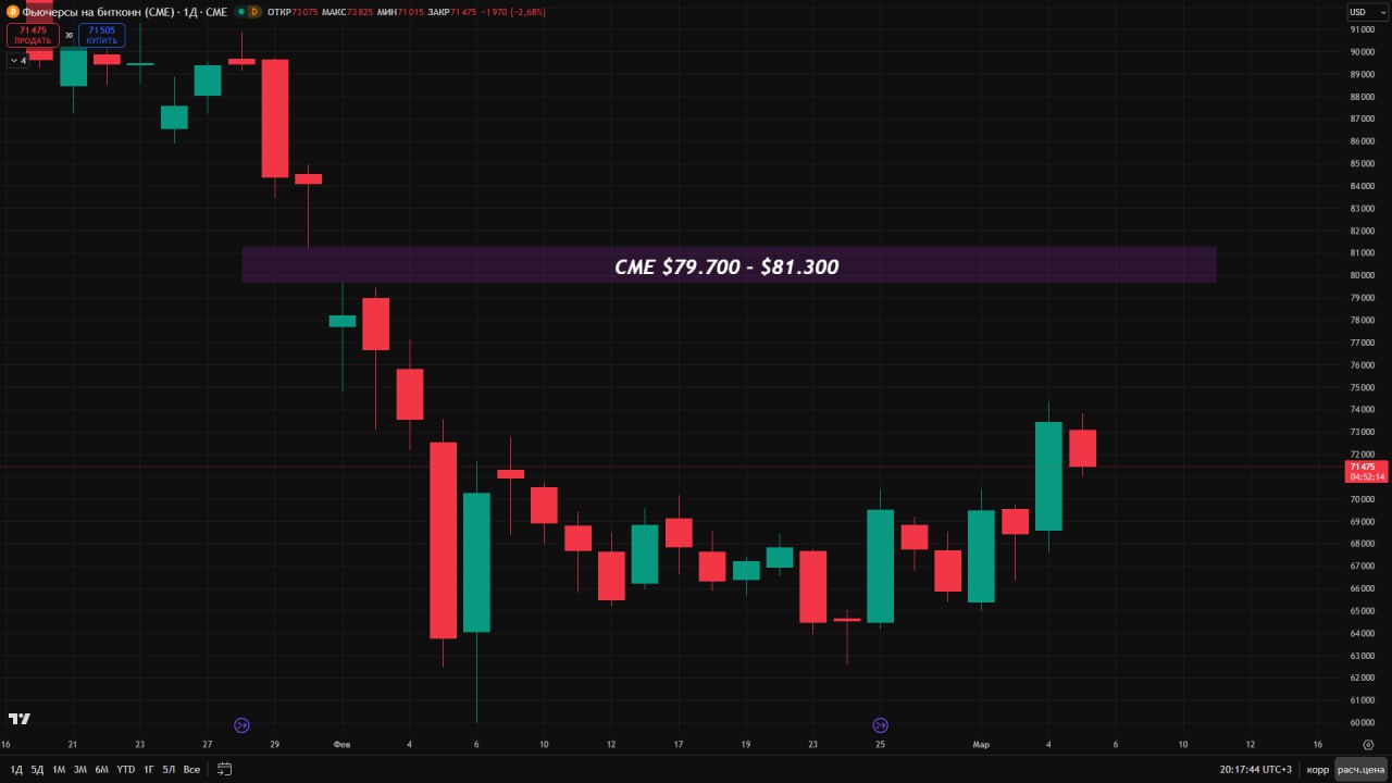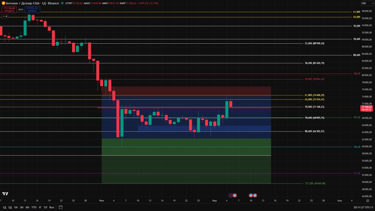 В случае, если закрытие произойдёт ниже зоны $70.800 — существует высокая вероятность отката до $65k. Если же этот уровень будет пробит, то следующим будет $58k.