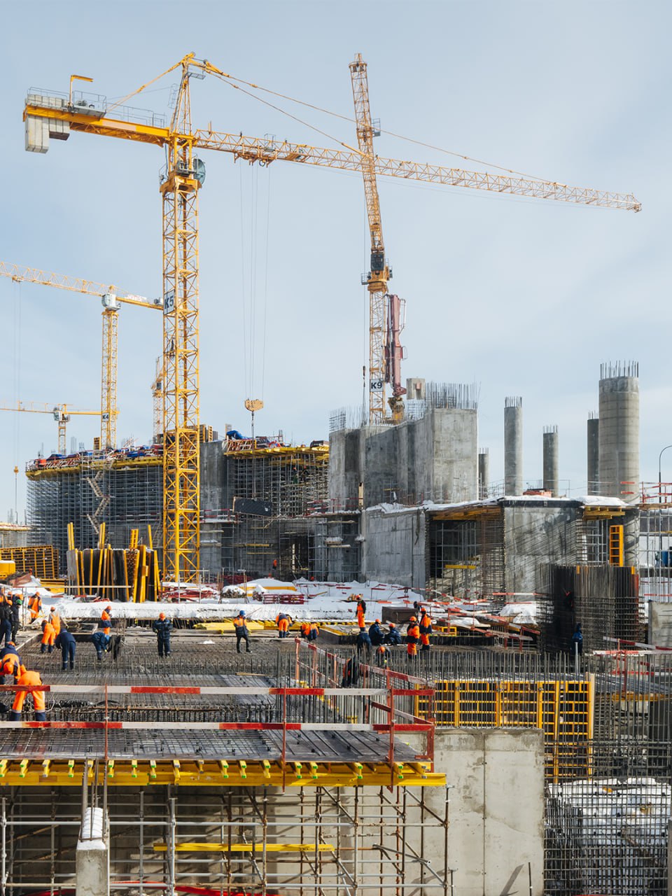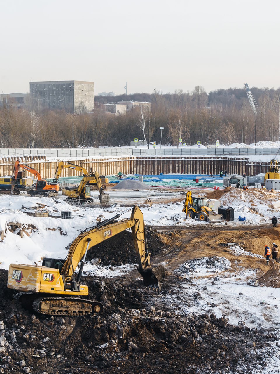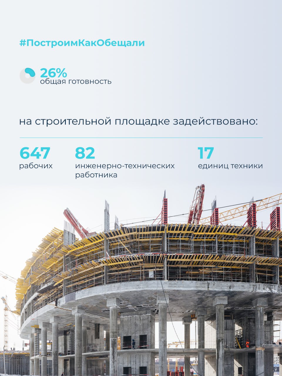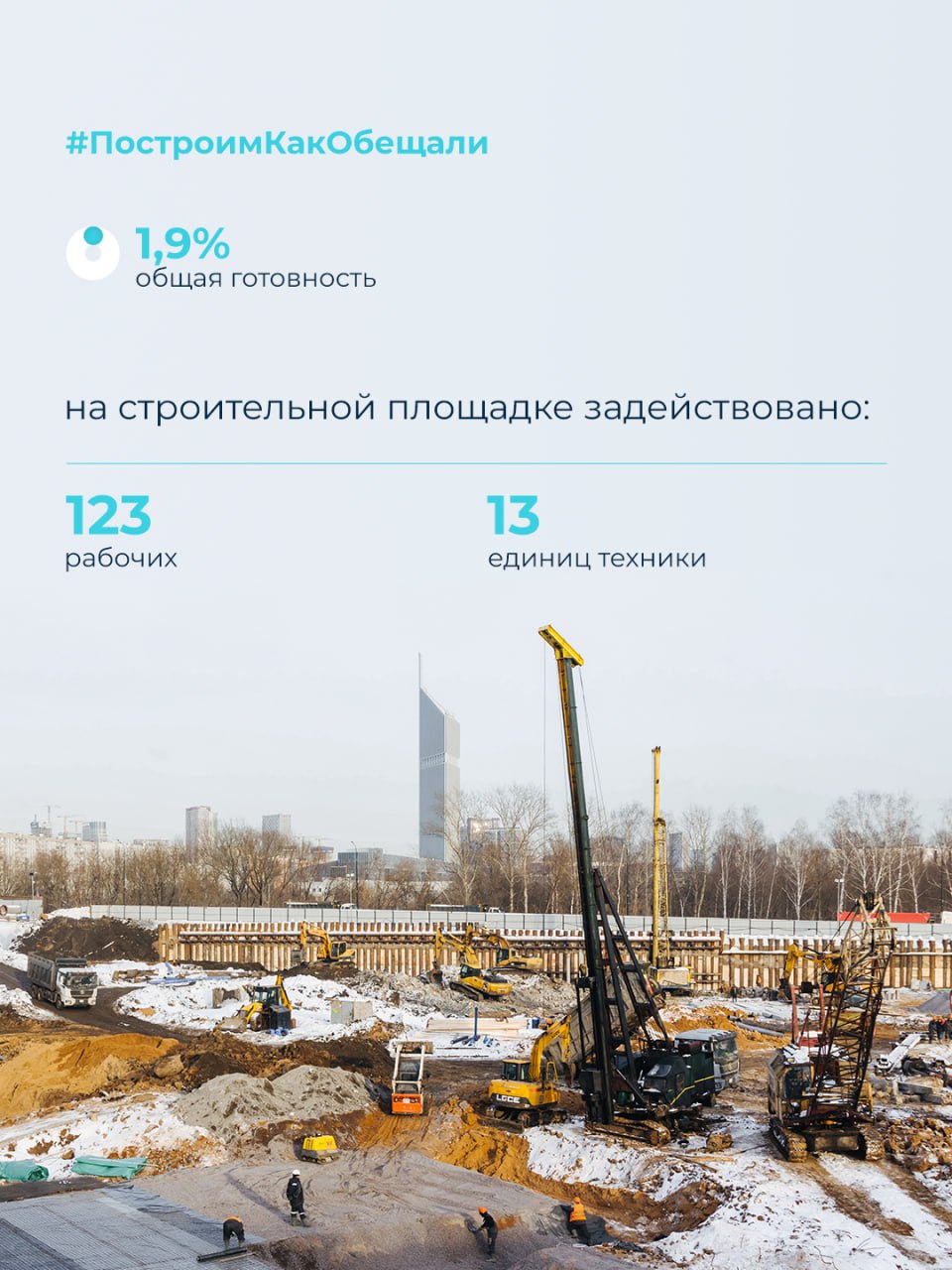 На строительной площадке работают 264 специалиста, 12 единиц техники. В работе 3 из 5 башенных кранов.