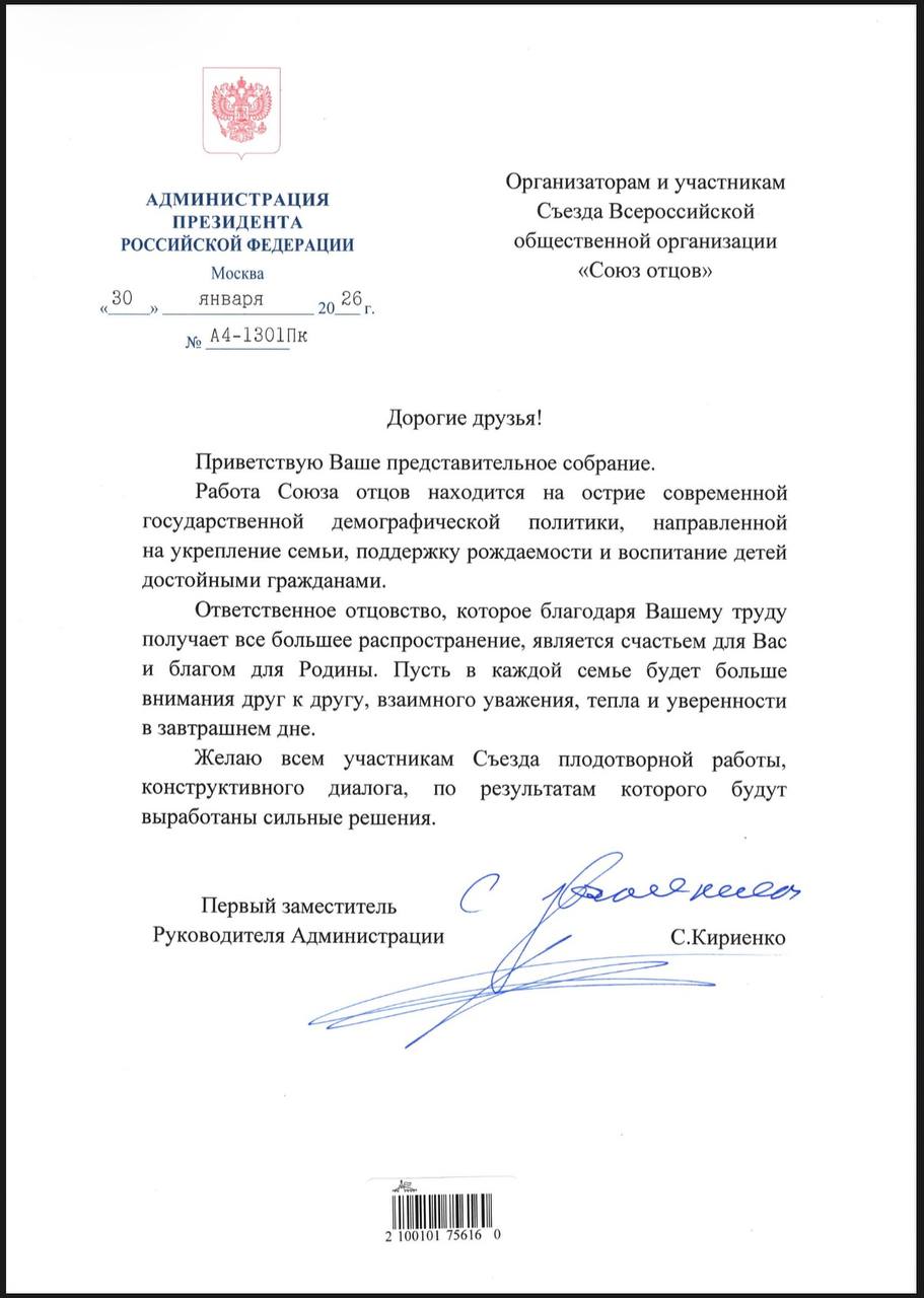 🔖 Кроме того, Александр Журавский передал исполнительному директору ВОО «Союз отцов» Александру Заремба письмо, лично составленное Кириенко Сергеем Владиленовичем - руководителем Администрации