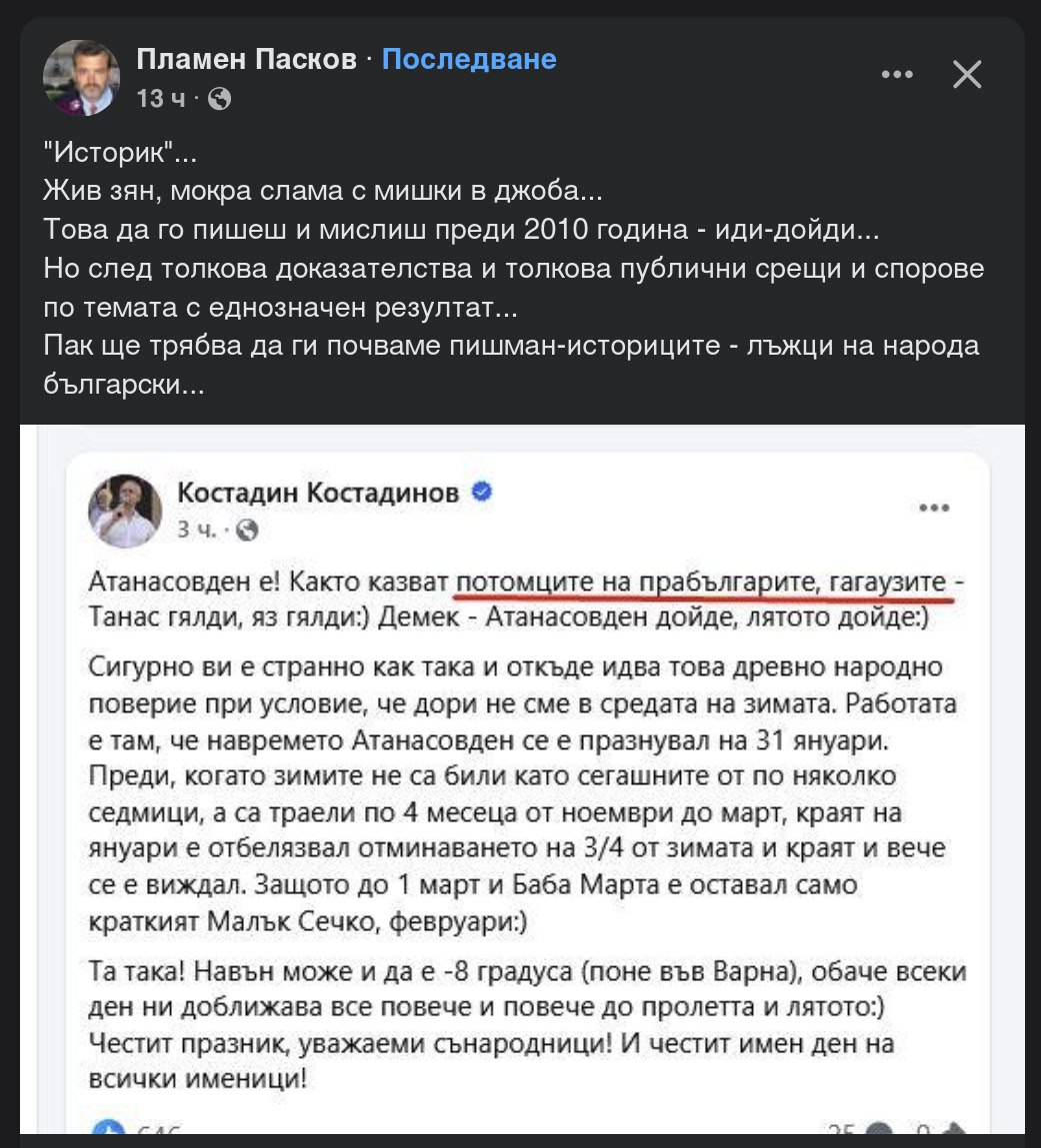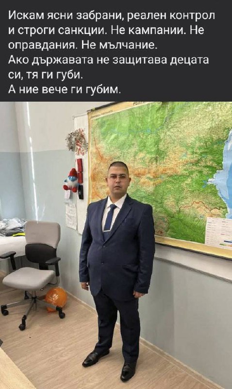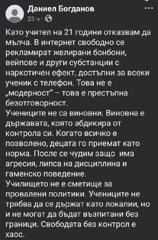От написаното не личи да си имаме работа с учител, нито изобщо с човек, който обича деца. Личи си контрол фрийк, за когото всяка социална тема завършва със „забрани, контрол и санкции“, докато реалният проблем е личен и прозира в неспособността му да навърже две поредни изречения в логическа последователност. Училището не е казарма, а децата не са материал за строяване. Човек с такъв светоглед е сбъркал професията. За старшина може и да става – особено с този гордо изпъчен тумбак, който сам по себе си е офлайн и онлайн реклама на нездравословен начин на живот.