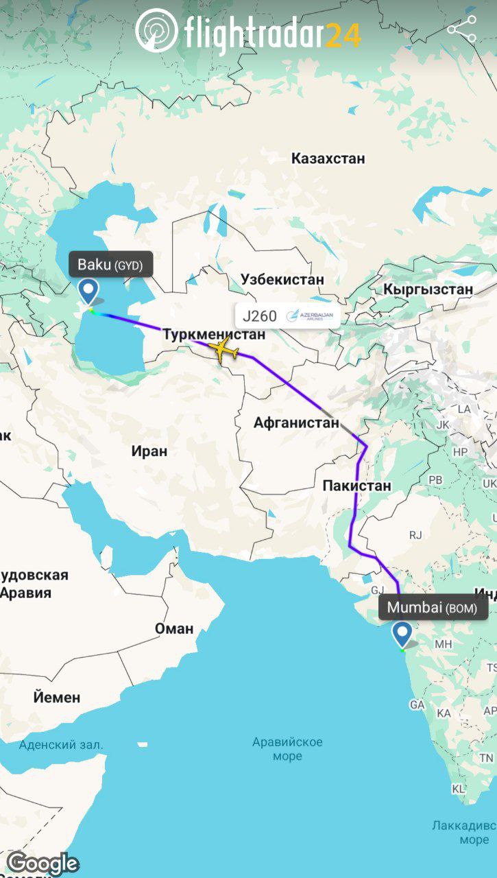 Кстати, если кому интересно, облёт территории Ирана на рейсе Мумбаи - Баку прибавляет всего 25 минут (речь о планируемом времени, без учёта ветра по факту, ну или возможного уклонения от летящих ракет).