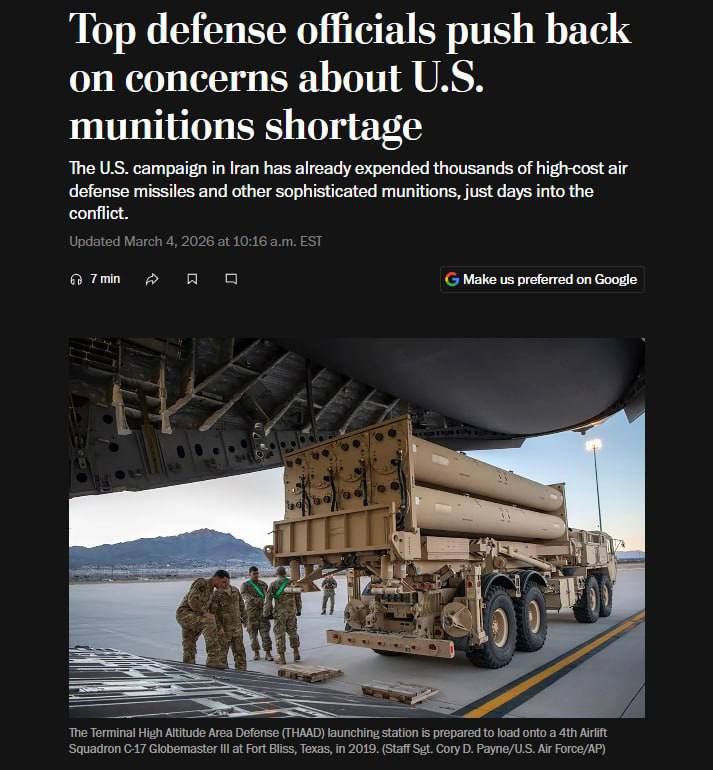 📍 Washington Post хабар беришича, АҚШ ҳаво ҳужумидан мудофаа ракеталари захираси шунчалик тез камаймоқдаки, ҳарбийлар яқин кунларда қайси таҳдидларни аввал тўхтатишни танлашга мажбур бўлиши мумкин.