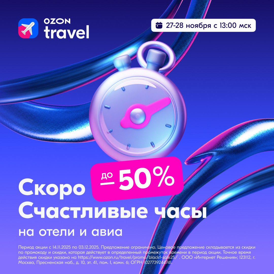 ✅Кстати, для клиентов Ozon Travel Premium скидки в Счастливые часы по промокоду на 10% выше! И распродажа начнётся на час раньше.