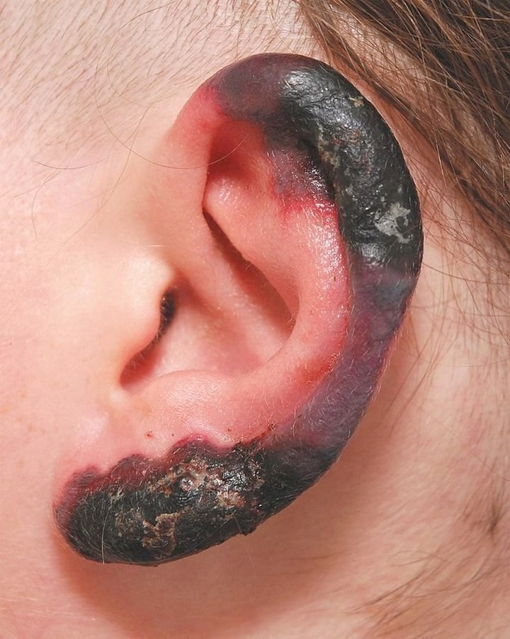 Девушка целый ходила без шапки при -35. На следующий у нее появились множественные некротические поражения кожи на носу, ушах и ногах, которые развились в течение нескольких дней. Половину уха пришлось ампутировать.