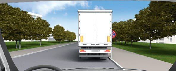 Зупинку в цій ситуації буде заборонено, бо вантажний автомобіль своїми габаритами сильно обмежуватиме (закриватиме) видимість іншим транспортним засобам, які їхатимуть за ним і наближатимуться до нього ззаду при русі на дорозі