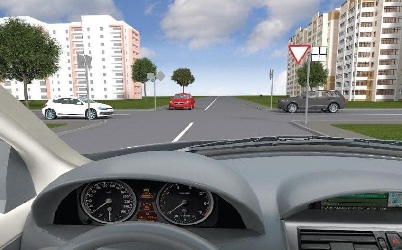 Згідно з пунктом 26.4 ПДР України, виїжджаючи з пішохідної або житлової зони, водій синього автомобіля повинен дати дорогу всім іншим учасникам дорожнього руху. Це означає, що водій зобов'язаний поступитися місцем як пішоходам, так і іншим