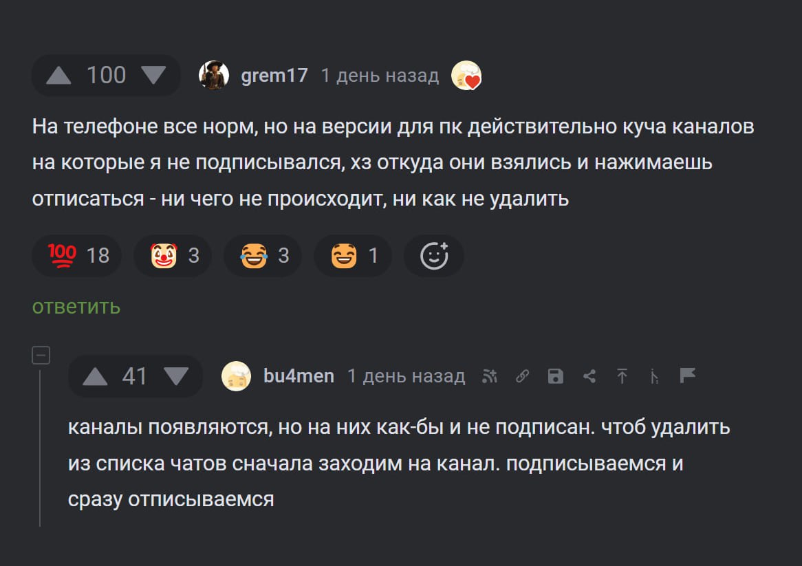 «Фича» появляется именно в десктопной версии приложения. В комментах юзеры даже скидывают друг другу гайды, как отписаться от Соловьёва, Симоньян и подобных каналов.