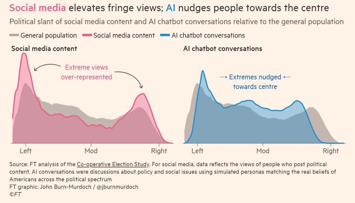Durante quince años, las redes sociales han amplificado voces radicales, erosionado la confianza en los expertos y alimentado el populismo. El mecanismo es conocido: las plataformas ganan dinero con la atención, y la atención la captura el contenido más inflamatorio. La IA, según un análisis reciente de John Burn-Murdoch en el Financial Times, funciona de forma opuesta. Los modelos de lenguaje tienden a acercar las conversaciones hacia posiciones moderadas y alineadas con el consenso experto, independientemente del punto de partida ideológico del usuario.