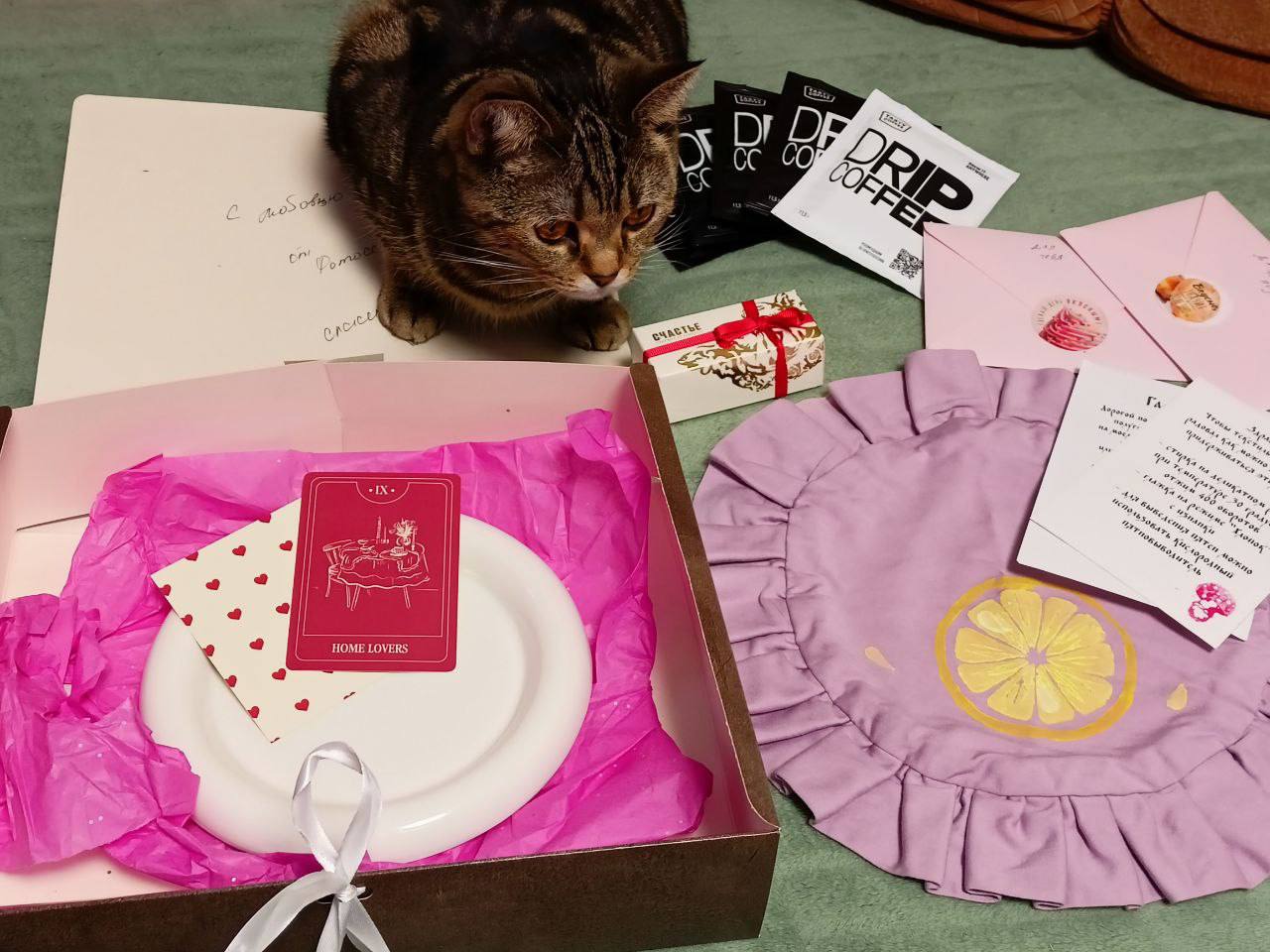 Для полноты картины я добавила в боксы по тарелке-бублику🍩 (они такие милые, что я чуть себе не оставила), а ещё кофе с конфетками для настроения. Потому что какой же бокс без вкусняшек?